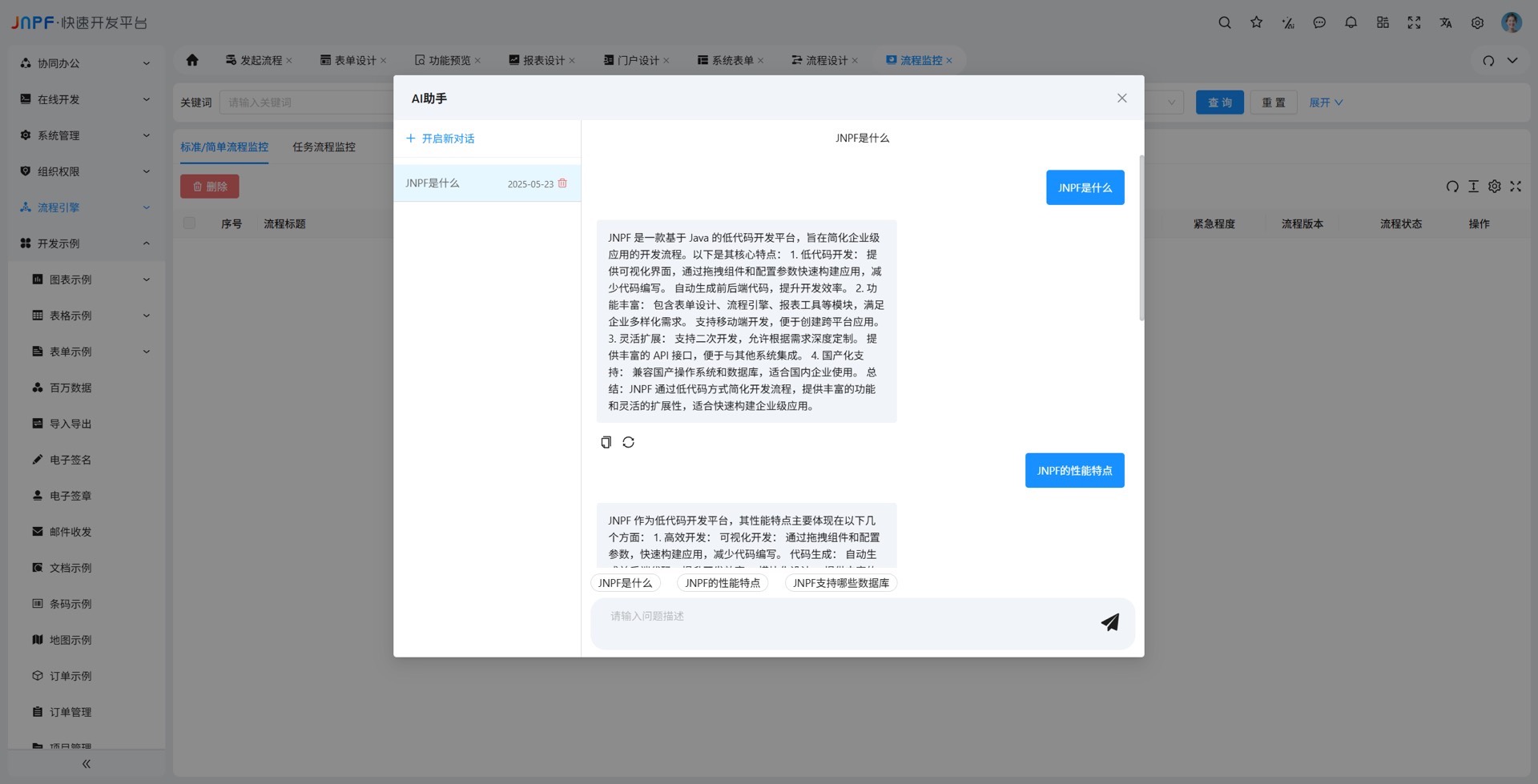 流程重塑、打印模板设计、BI大屏、表单设计、流程引擎、AI建表、AI助手、代码生成