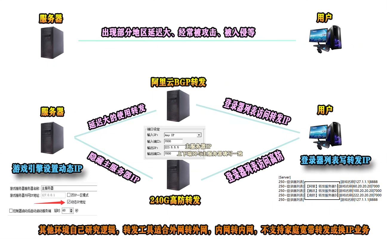 针对传奇、传世等游戏开服场景,通过端口转发可隐藏服务器真实 IP,有效降低被攻击风险;同时借助多节点转发分流游戏流量,避免单服务器压力过大导致的卡顿、掉线,保障玩家体验。