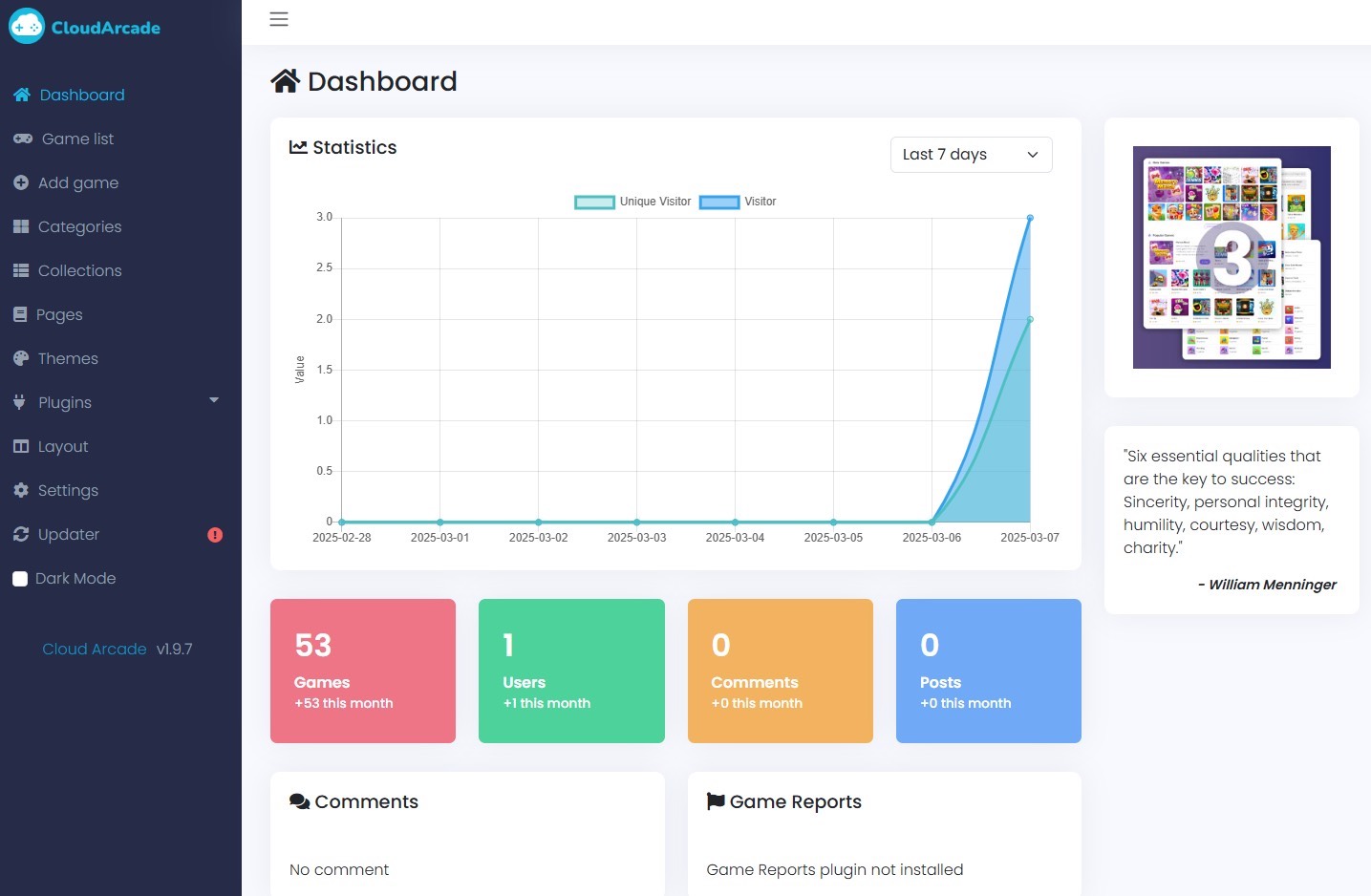 通过现代化的后台界面,你可以轻松管理游戏库、更新网站主题、调整设置,甚至直观查看网站统计数据。无论是新手还是有经验的站长,都能快速上手。