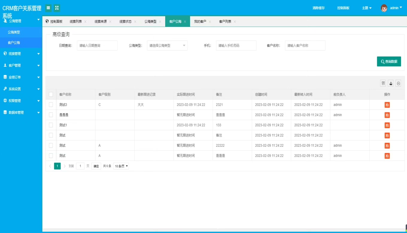 客户公海系统、线索管理功能、客户管理系统、业绩订单查询功能、