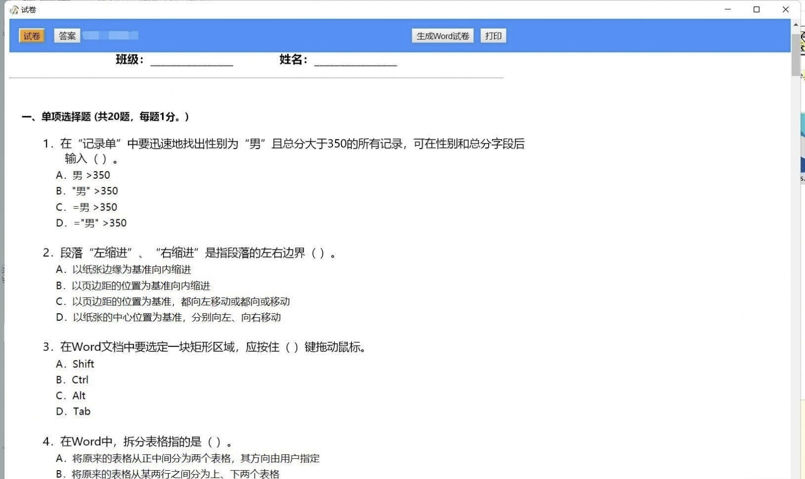 软件功能:1.编辑题库,2.加入题库,3.生成试卷,4.自动生成答案,5.生成word,6.自动排版,7.一键打印。