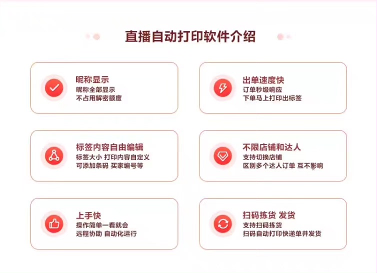 这款软件及时解决了直播间不能自动打印的情况,,同时有以下7大强大功能: