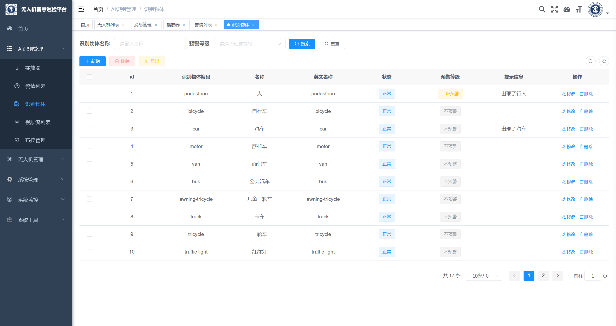 自定义识别的参数:置信度,识别的物体类别;自定义报警参数:预警最短时间间隔,预警类别等。可以对视频流进行识别开始,识别终止等操作。