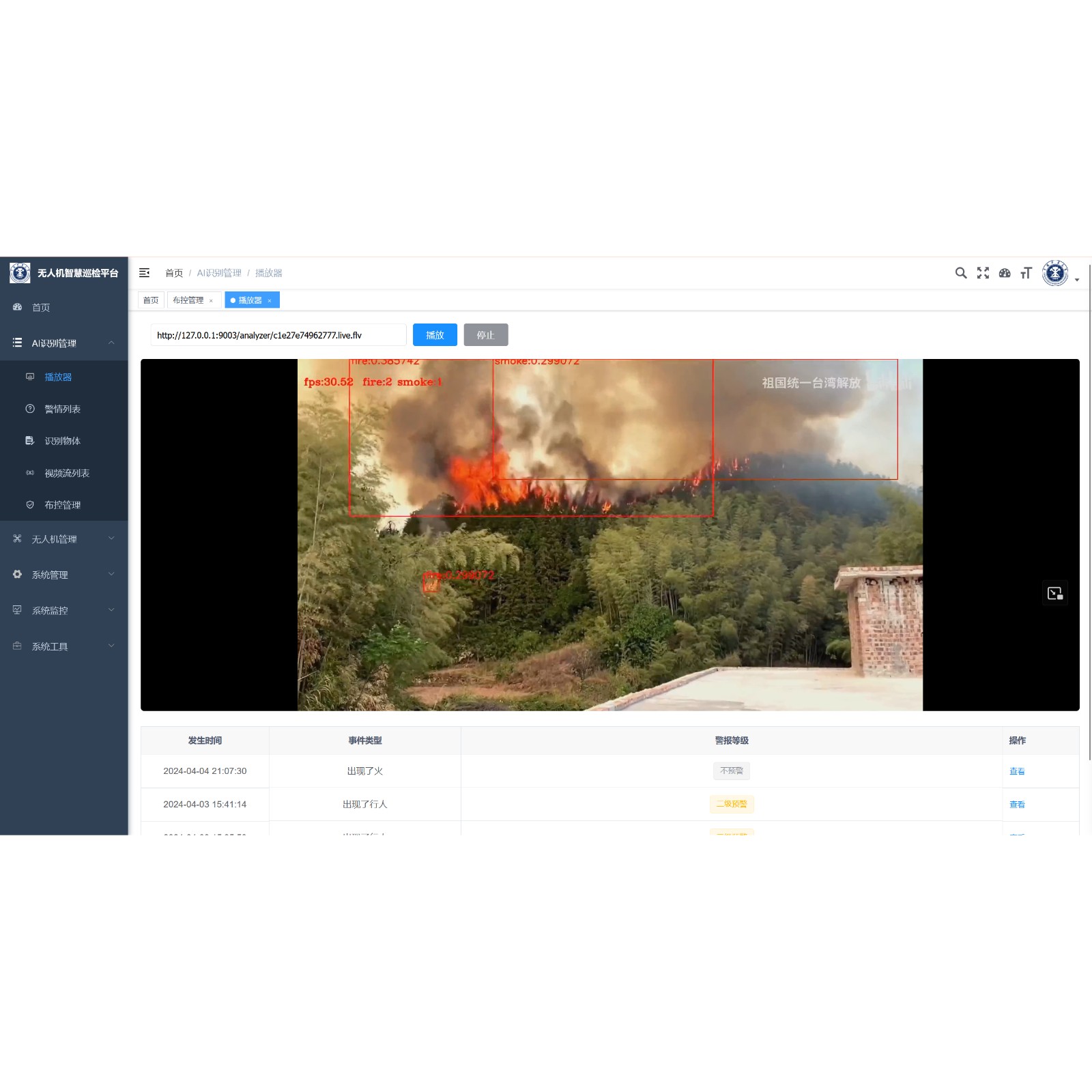 工作大致流程:使用ZImediaKit流媒体服务器接受从无人机网关的视频流,然后收到Mqtt消息根据用户设置进行开始识别,调用视频分析模块进行拉流处理,解帧,得到视频帧,对帧画面使用Tensorrt推理加速处理视频帧,使用OpenCV对视频帧进行画框,然后合成帧,推流到ZlmediaKit流媒体服务器。前端使用Flv.js进行播放,如果出现设定的预警标准,会进行弹窗预警以及生成预警信息。