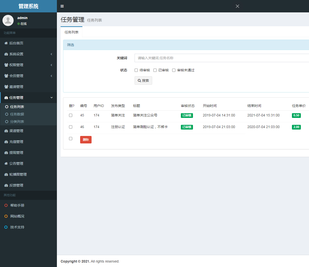 3.任务管理:可以对用户进行任务编辑审核,放弃审核任务,管理员可以后台审核任务通过,才能显示出来