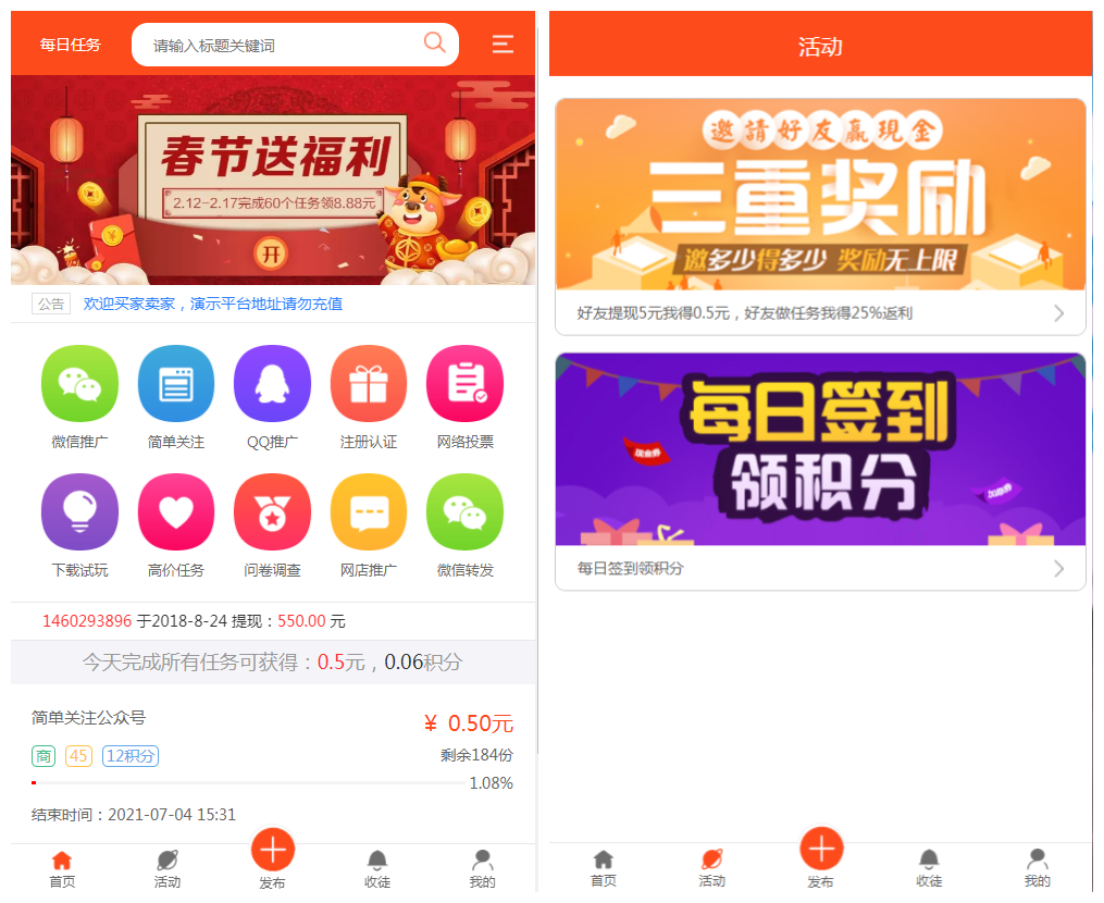 1.手机任务面,一个手机版的任务需要,支持雇主入住发布任务,用户是雇主也是做任务可以自己发任务,做任务。