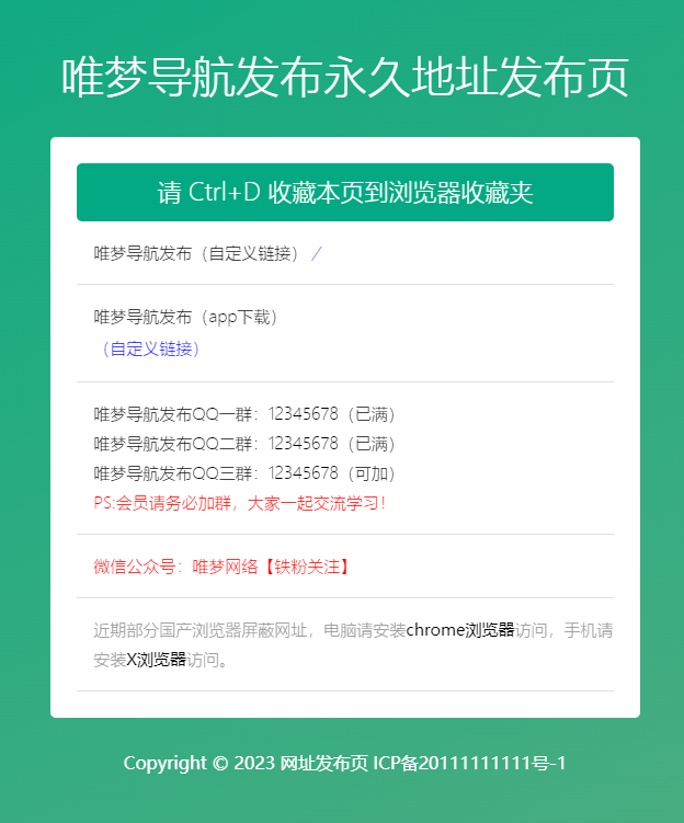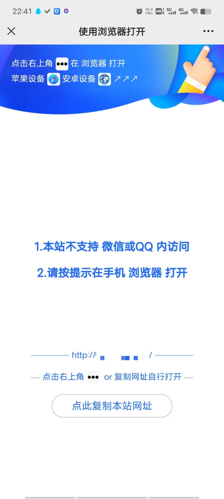 源码没有后台,可配置到你个人网站使用,WX/QQ 访问域名自动弹出提示跳转浏览器。