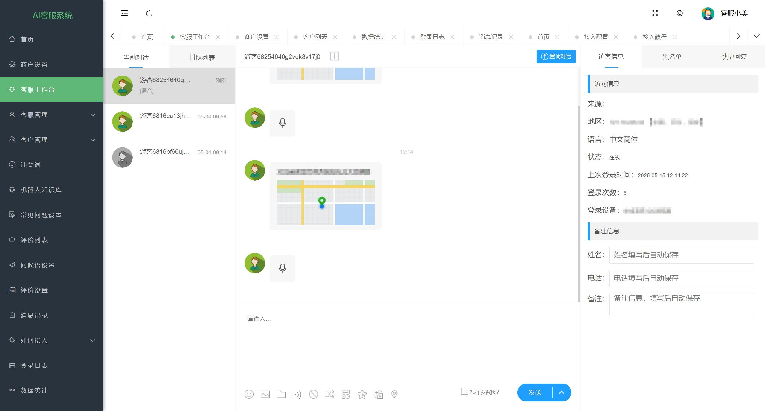 3、支持发送定位(百度地图api),发送语音功能;4、可对接H5网页小程序公众号APP多平台;5、支持二维码和专属链接访问;