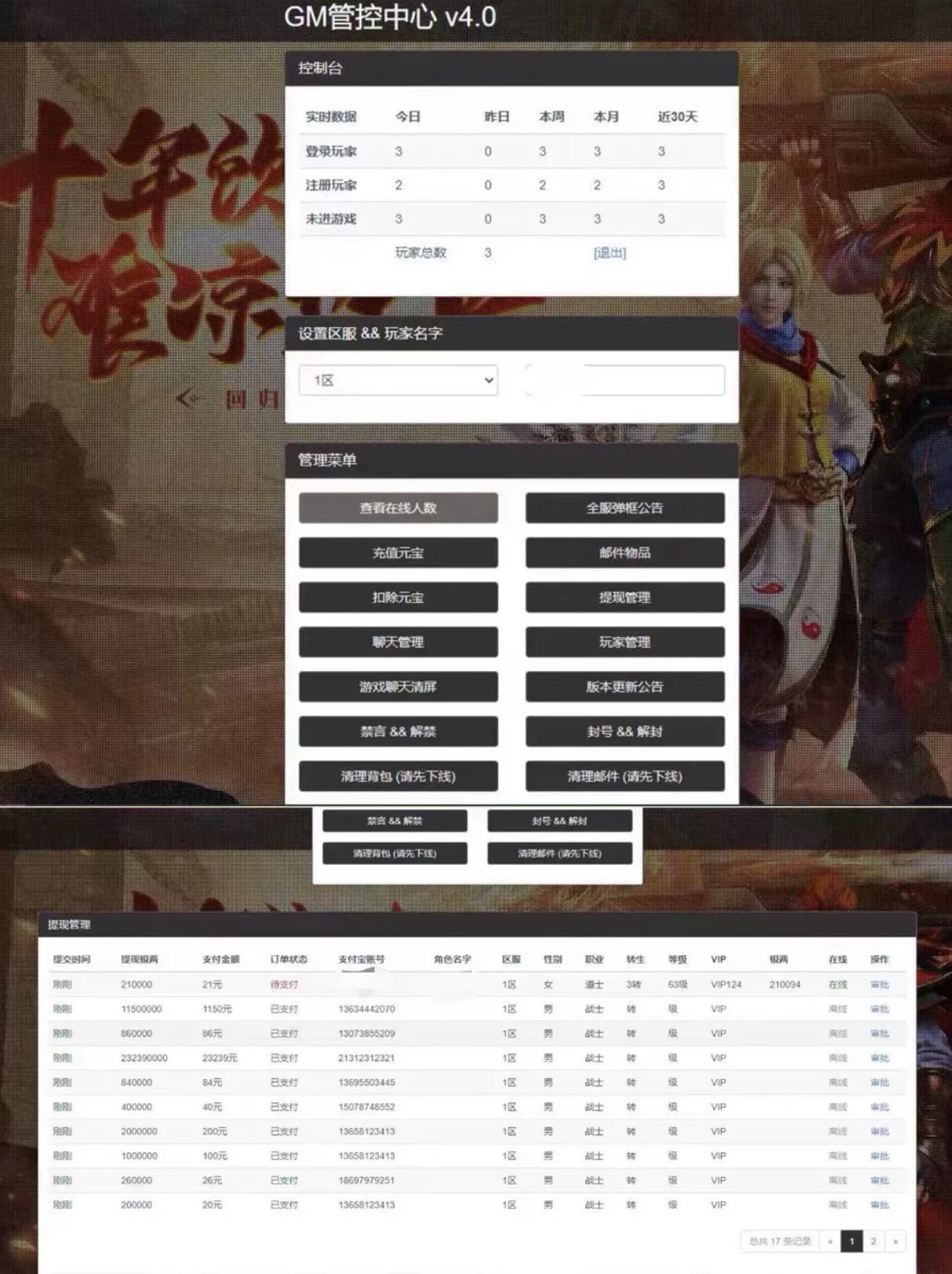 2.全新GM后台.充值/邮件/公告管理/玩家信息查看/提现管理等功能.