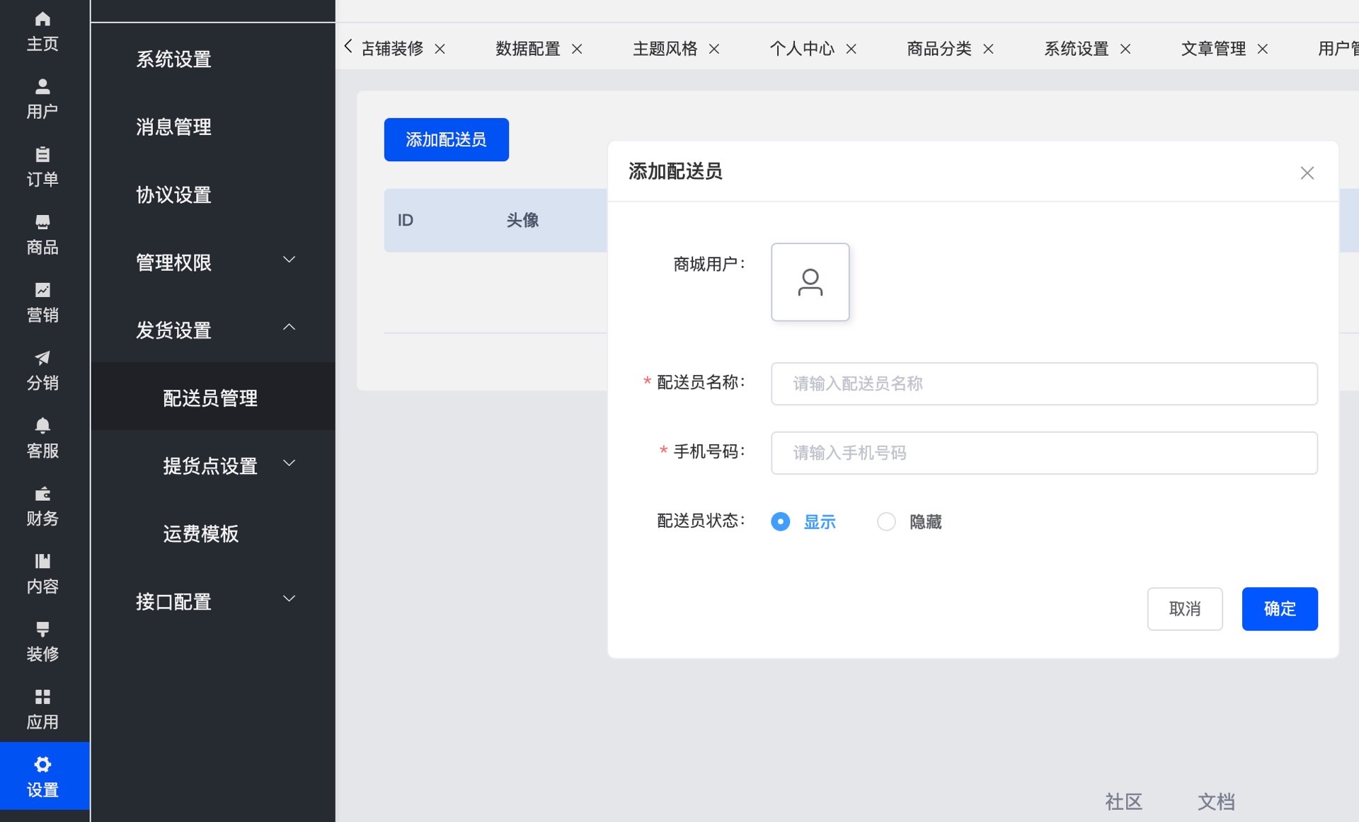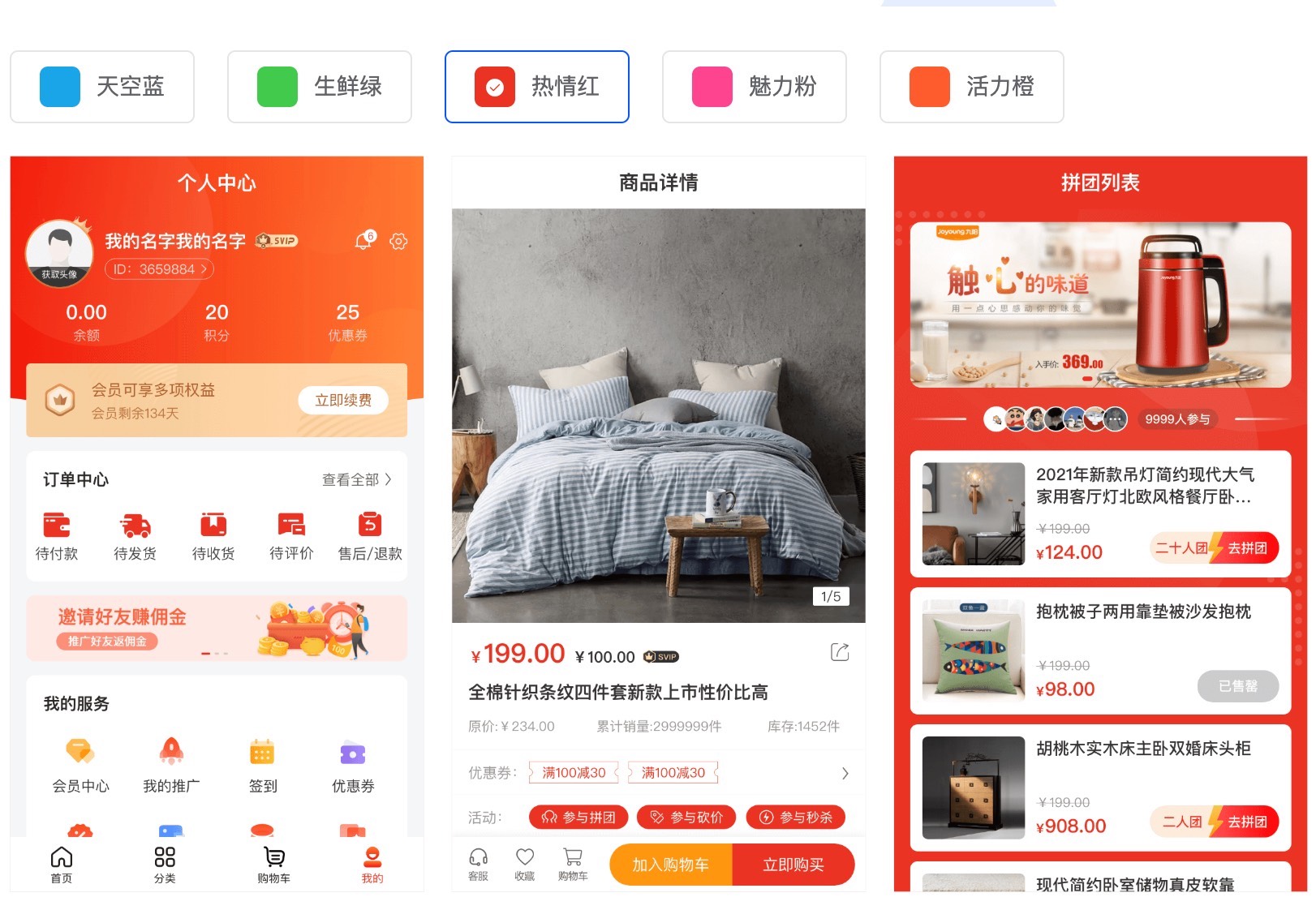 营销:优惠券、积分管理、抽奖管理、砍价管理、拼团管理、秒杀管理、付费会员、直播管理、用户充值、每日签到、渠道码、