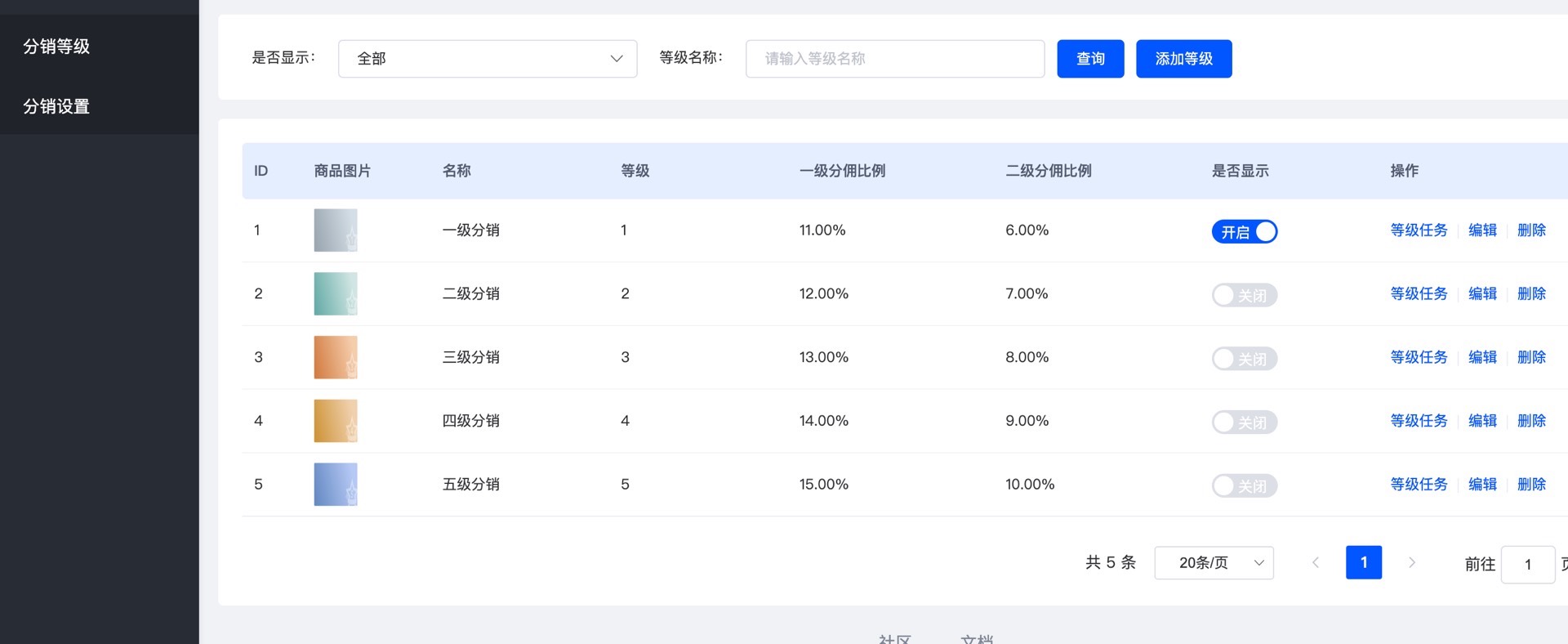 分销:可设多级,可设等级任务(邀请好友成为下线、自身消费金额、自身消费单数、下级消费金额、下级消费单数)