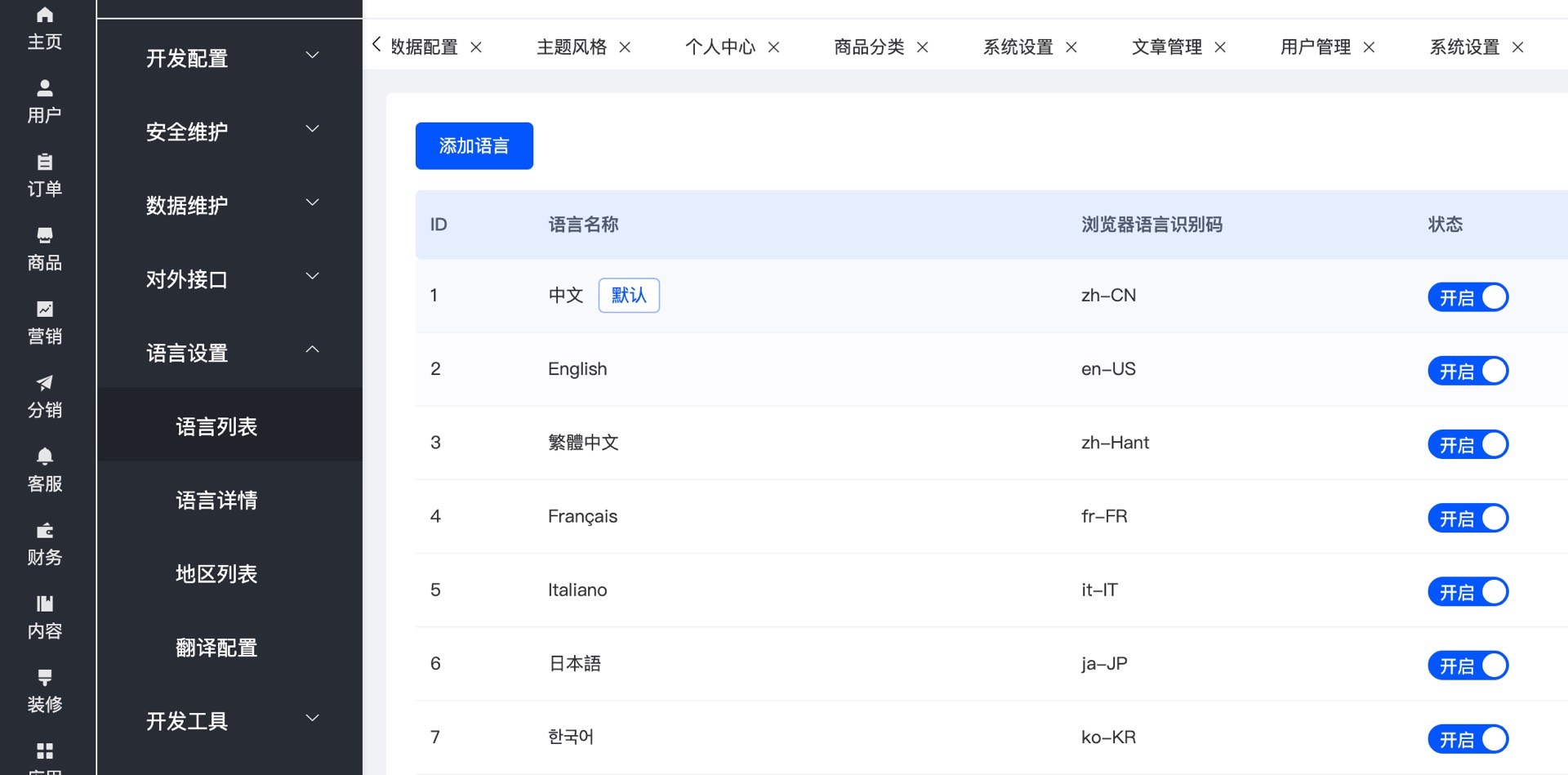 2.UI的多语言后端可控(增删改查),默认己添加10种