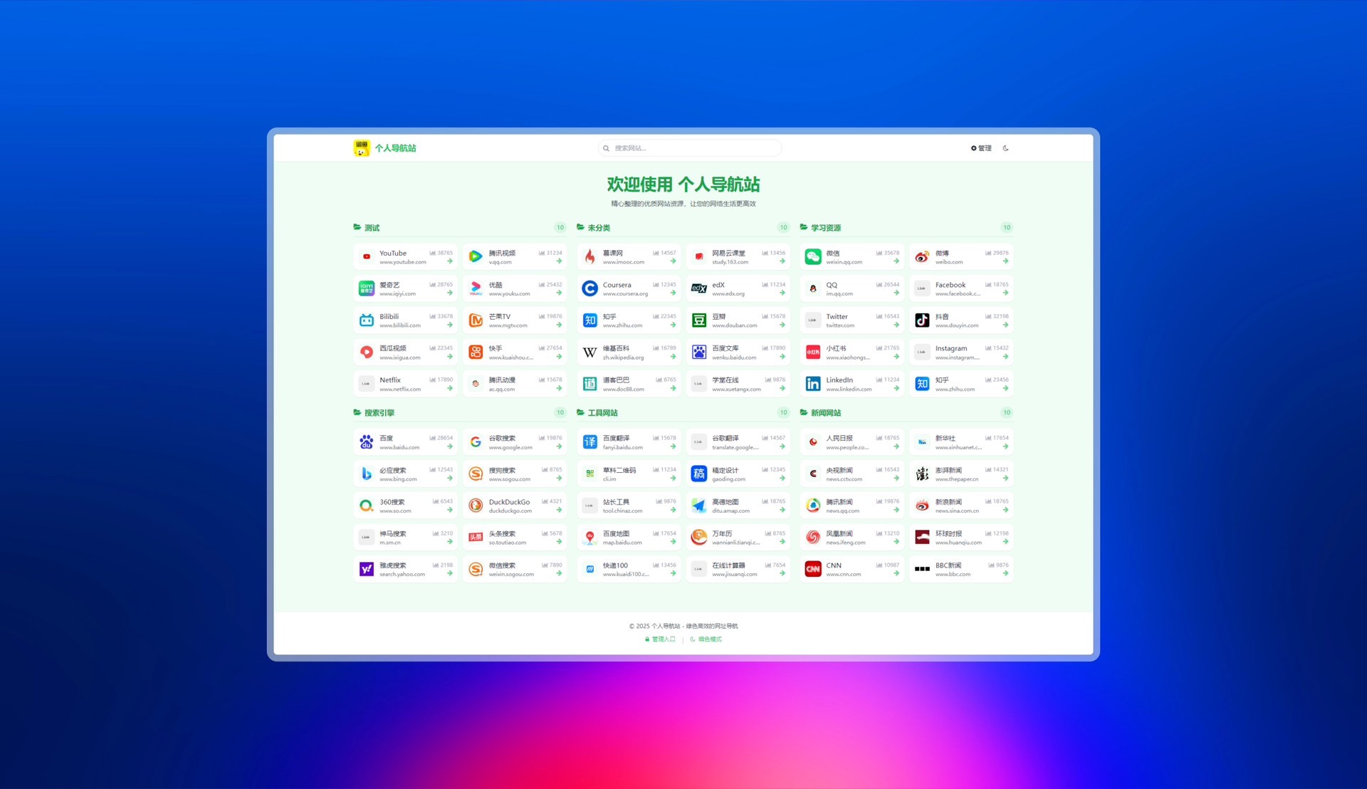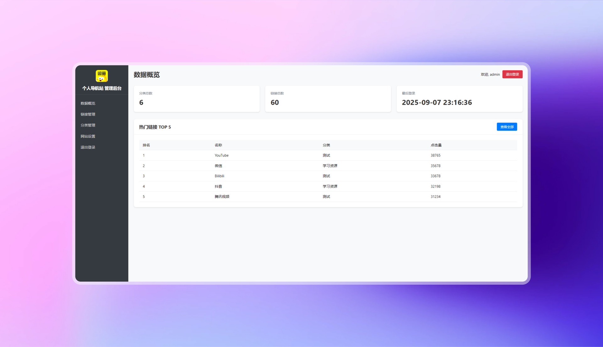 具体功能演示看图,支持点击次数统计,支持增加修改分类显示,支持网址编辑,图标上传或者远程链接,支持后台修改logo修改密码,不依赖数据库,json存储数据,支持手机端响应式设计,所有代码带注释,方便后期修改和二开,主题颜色可以在index代码里面修改。