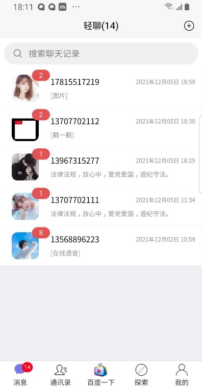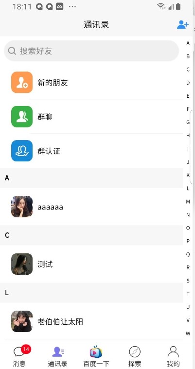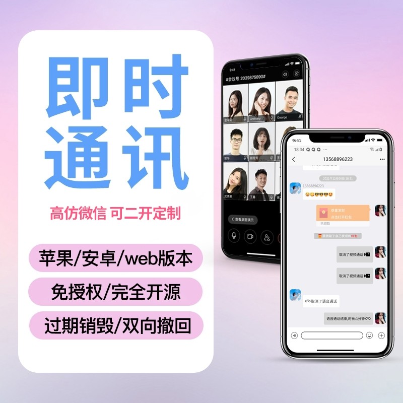 2、 支持文字、表情、图片、语音、音视频通话、单聊、群聊、探索、朋友圈、红包等完备的IM功能。
