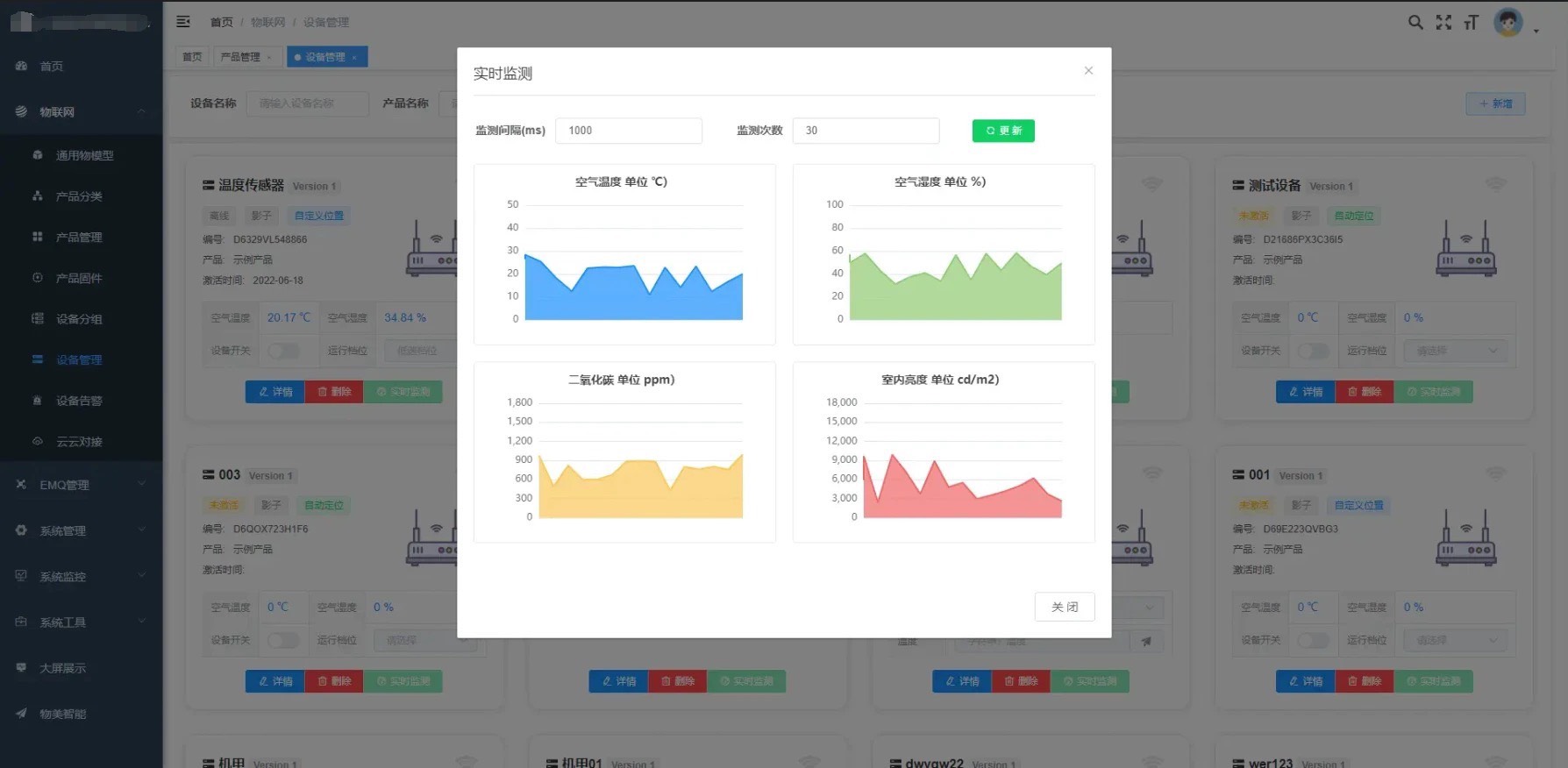 产品管理: 产品、产品物模型、产品分类、产品固件、设备授权码、自定义告警等