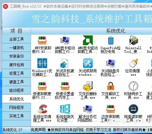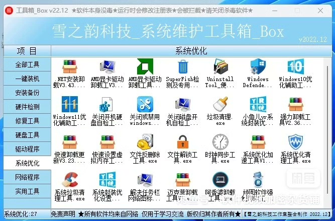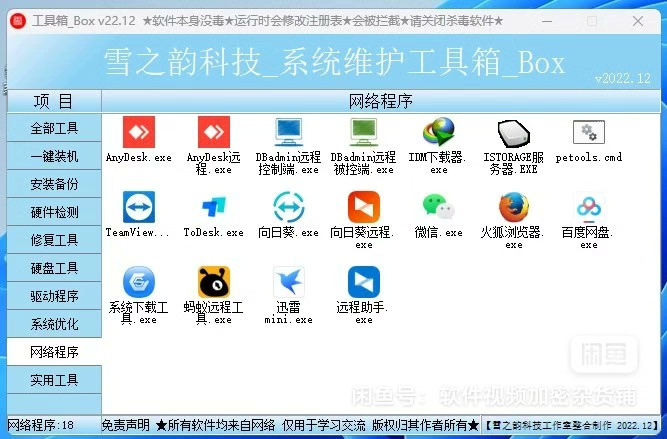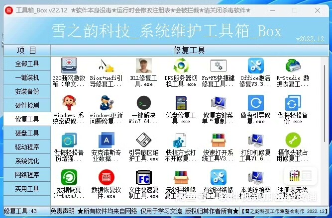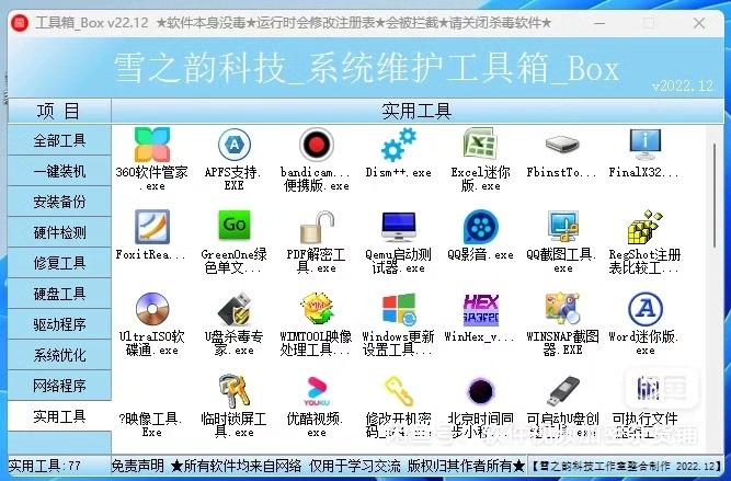 包含了262种工具。此工具箱于2022年10整合编译完成,又增加了几款工具,功能很强大,此工具包是电脑维护工作者必备使用的工具,是网维工作人员必不可少的工具,喜欢的下单吧