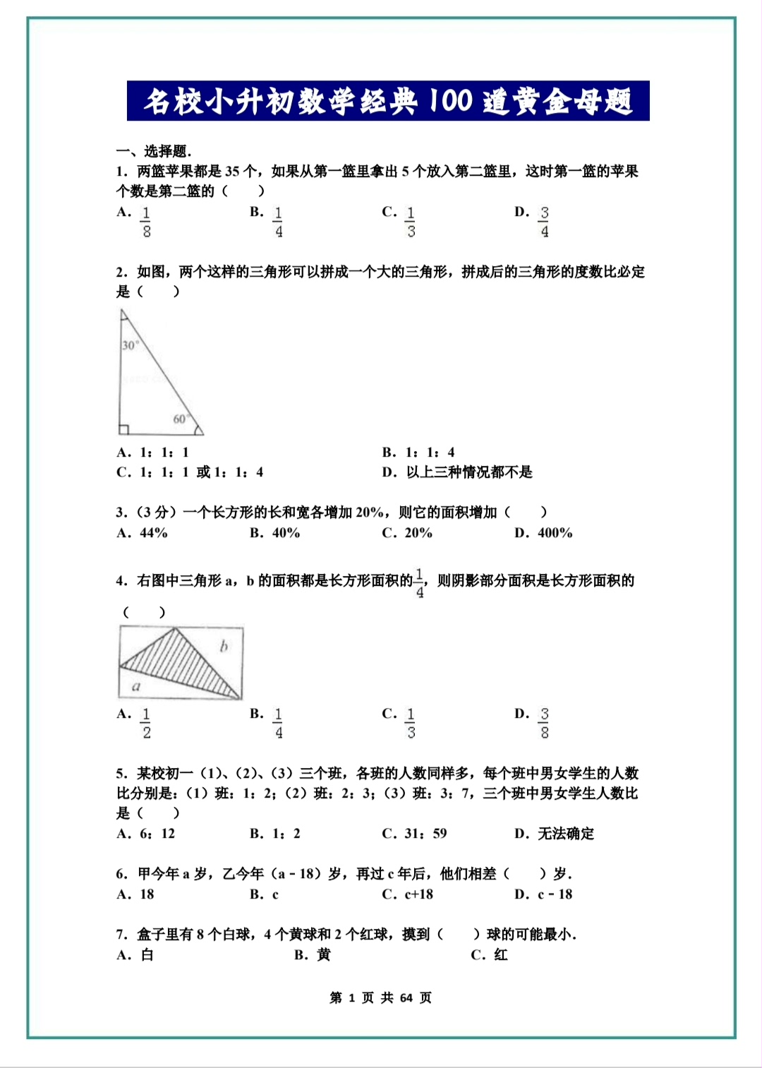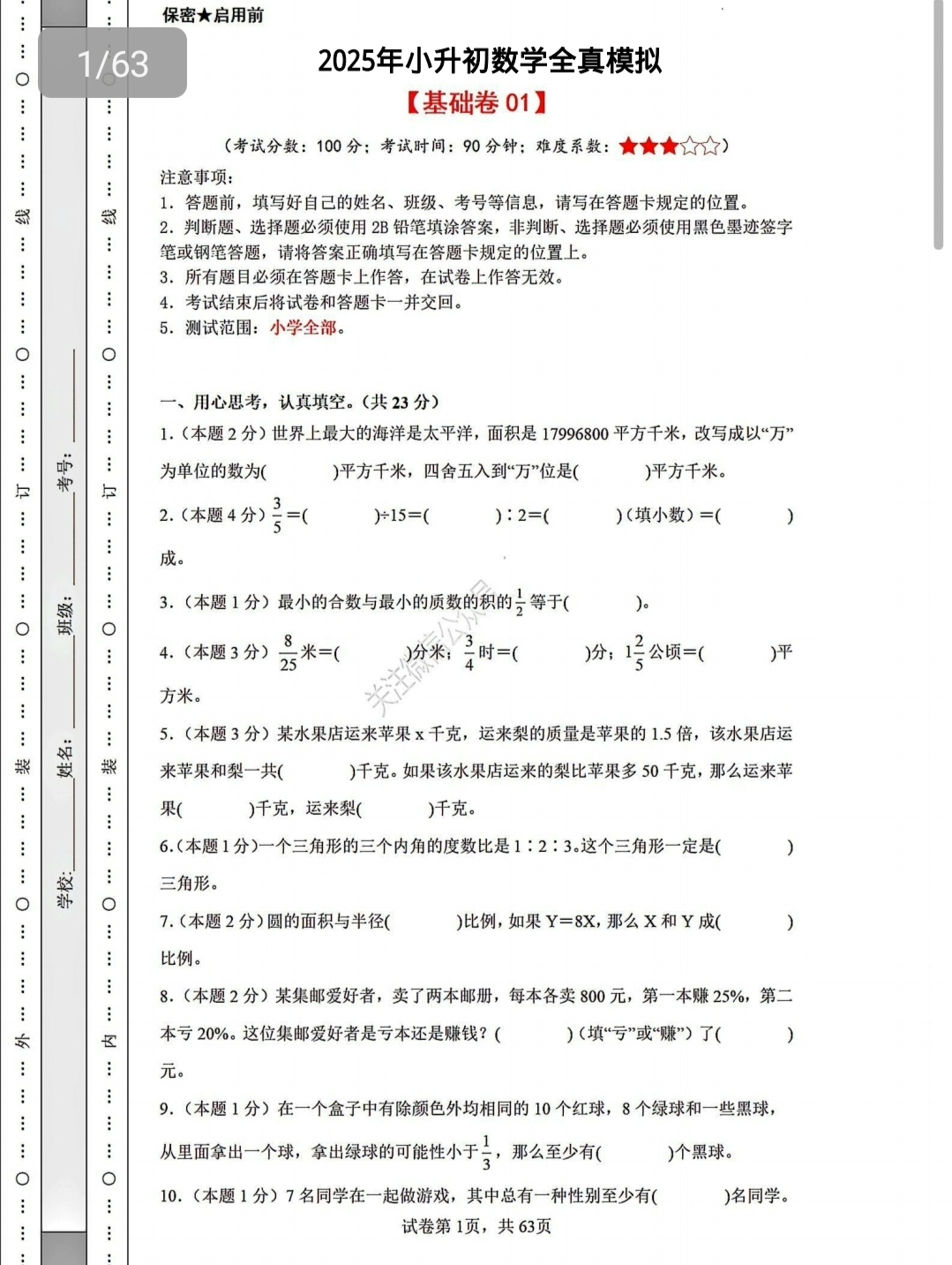 (7)小升初数学全真模拟试卷12套(基础卷6套+培优卷6套。
