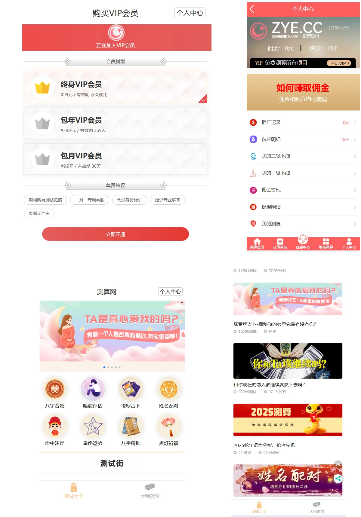 2025 年最新易经测算系统专业平台,提供无减删完整开源版本,同时整合支付功能与代理分销提成机制,是一款功能完备的专业测算平台系统。平台涵盖八字精批、姓名详批、八字合婚等多项测算服务,功能丰富且全面,可满足不同用户的测算需求。目前市面上多数同类型平台版本,均基于本系统进行二次开发而来。本系统无任何加密处理,实现全开源,且已对旧有数据进行更新迭代,现已搭载 2025 年最新数据。系统内置三级分销体系,同时完成官方支付与易支付的对接,并且附带详细的搭建操作说明,用户获取后可直接上手使用。