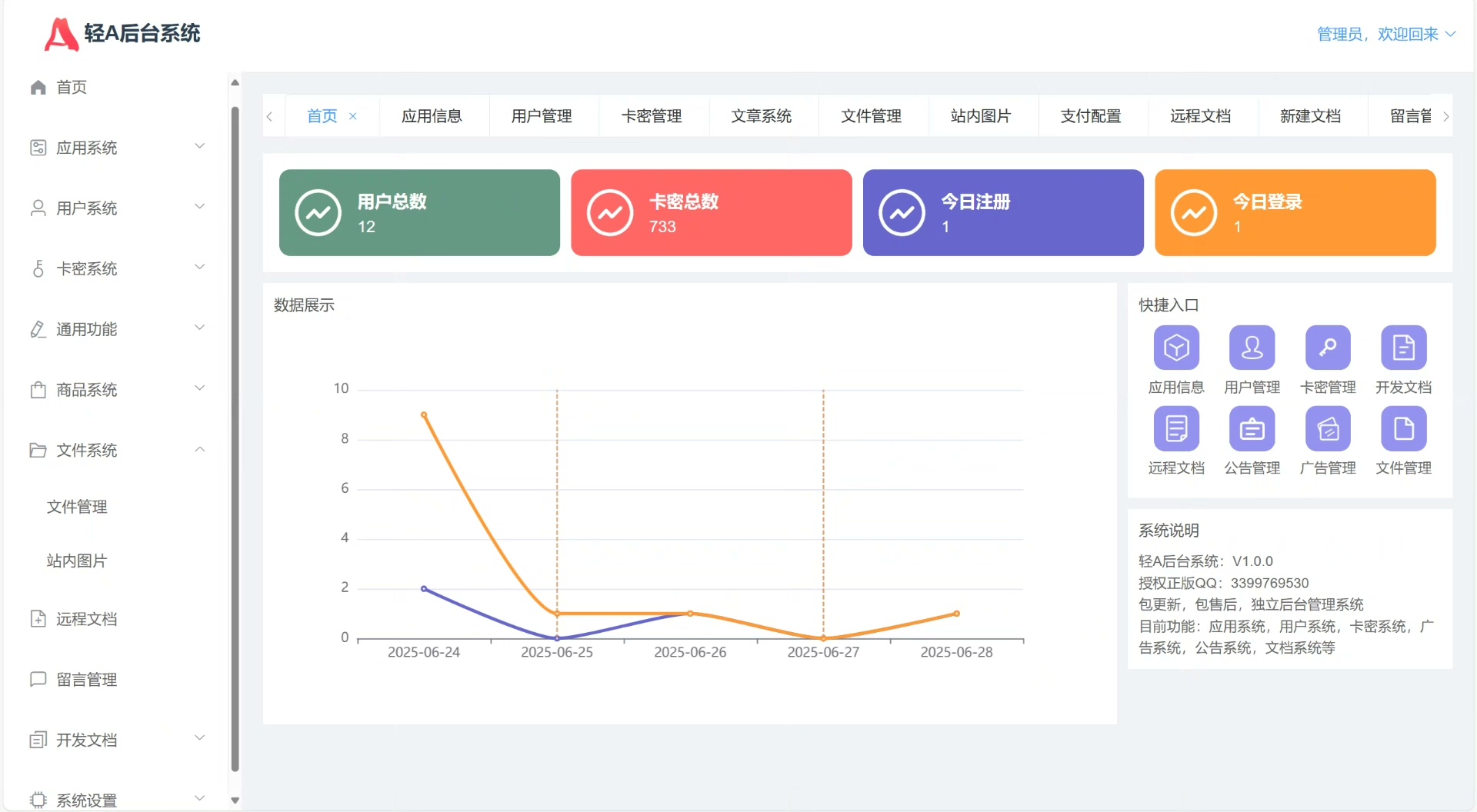 用户系统,卡密系统,会员系统,应用系统,文件管理系统,远程文档,远程留言,远程广告,远程公告,文章列表,随机图片等