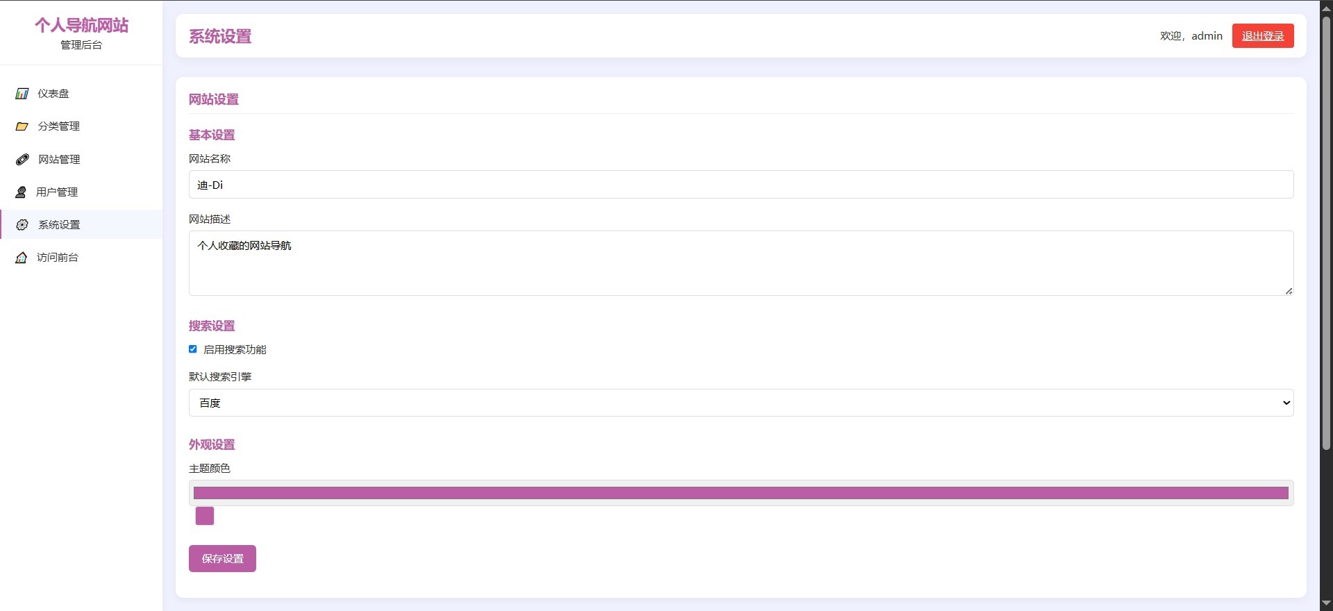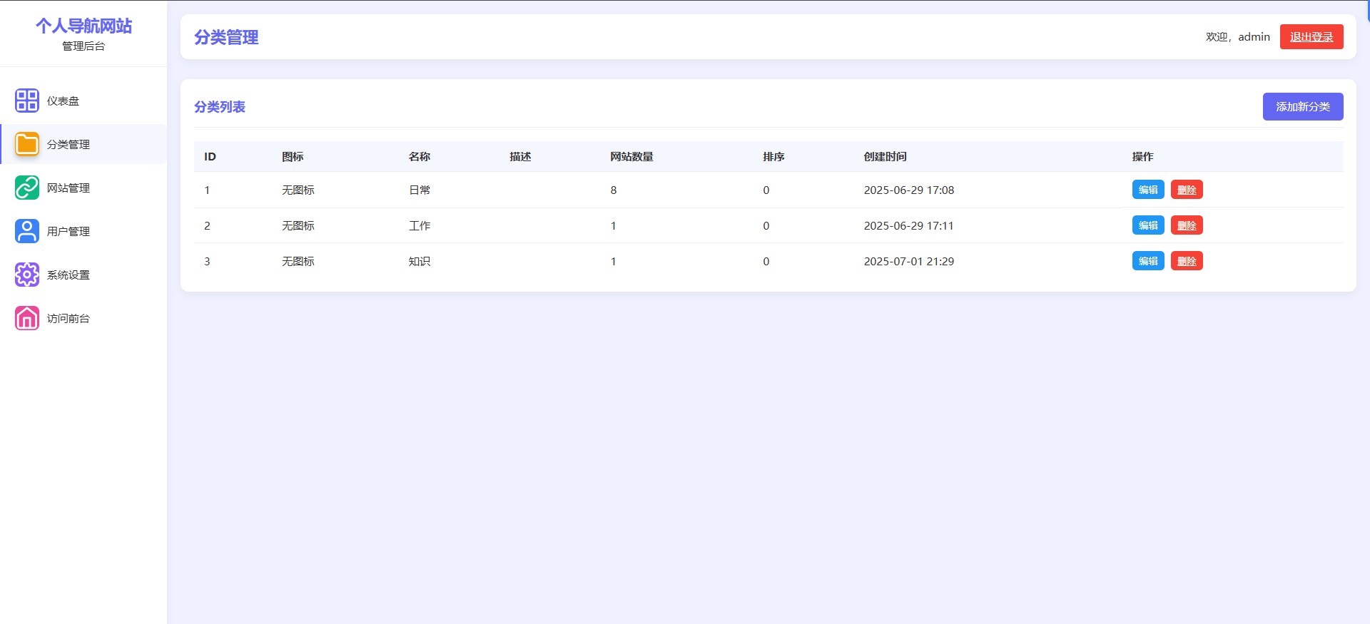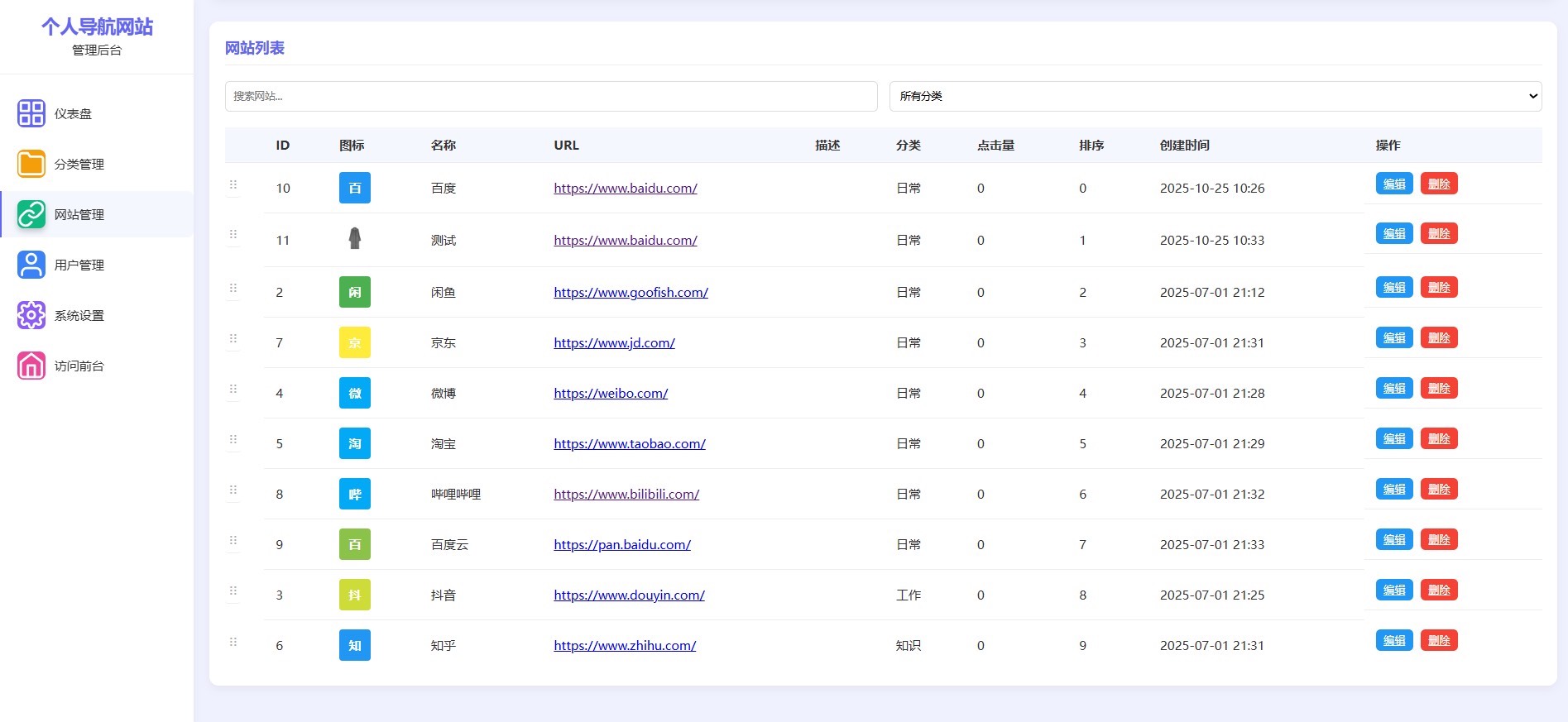系统具备完整的增删改查操作功能,用户可通过后台对导航分类、网站链接、图标信息等内容进行灵活管理。