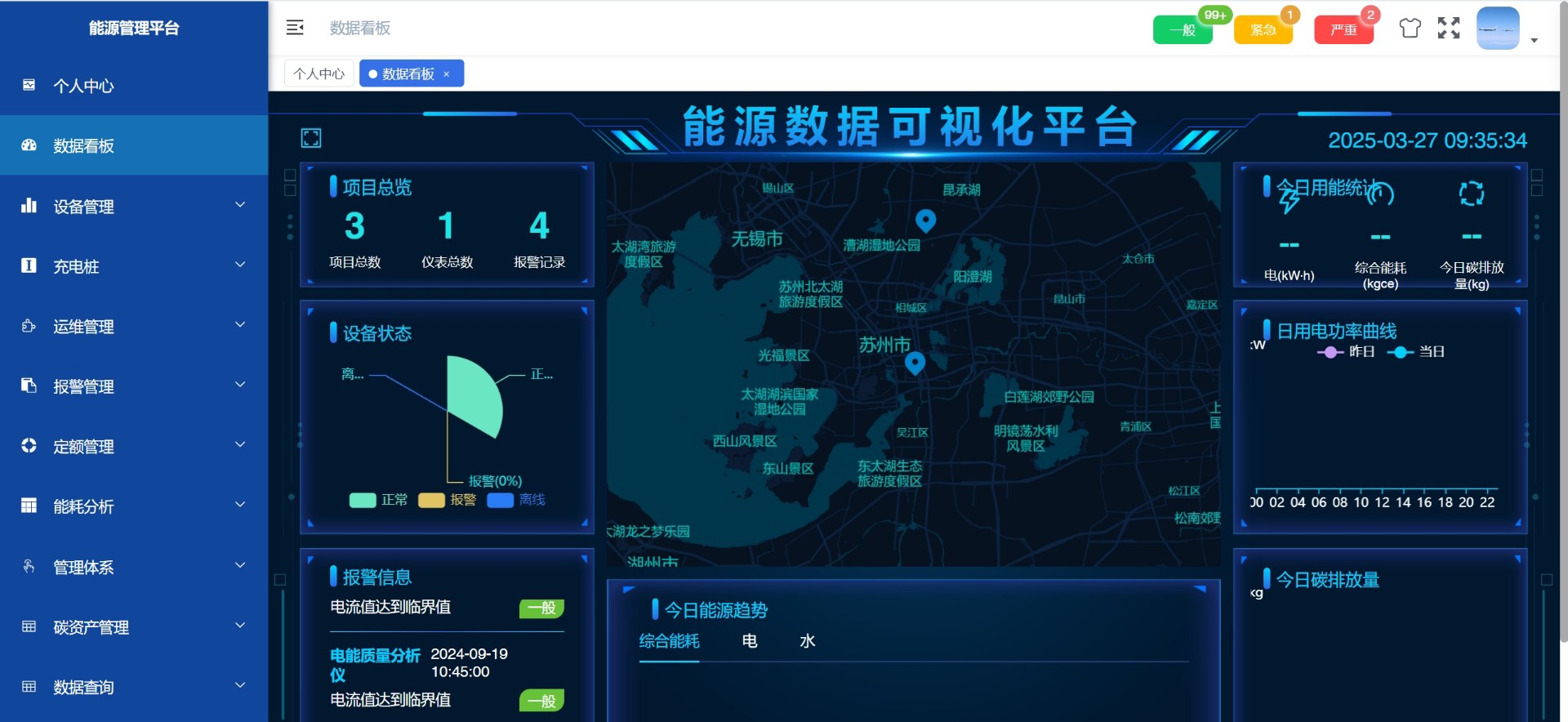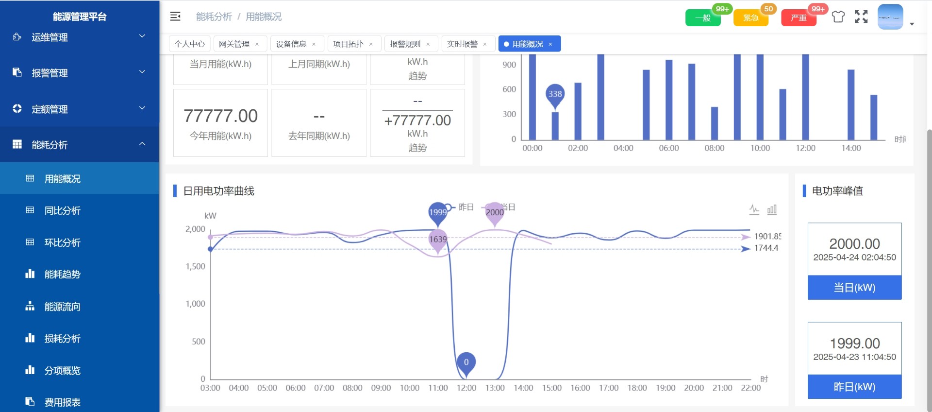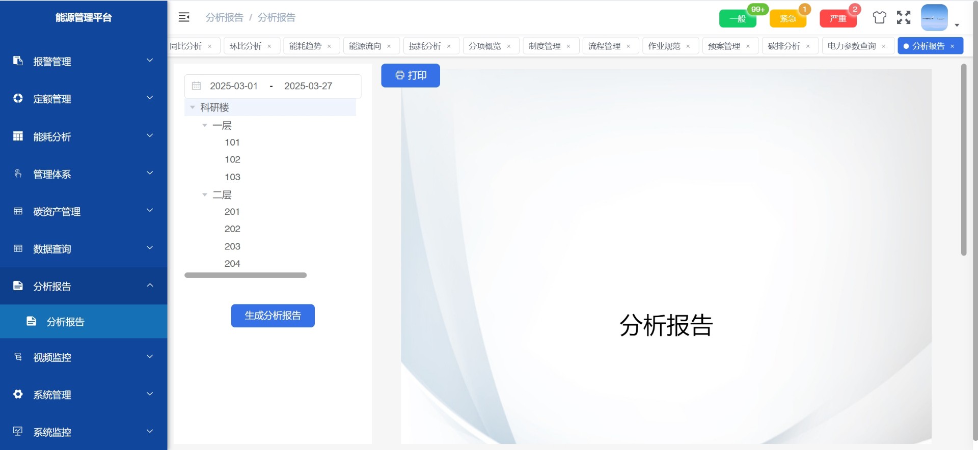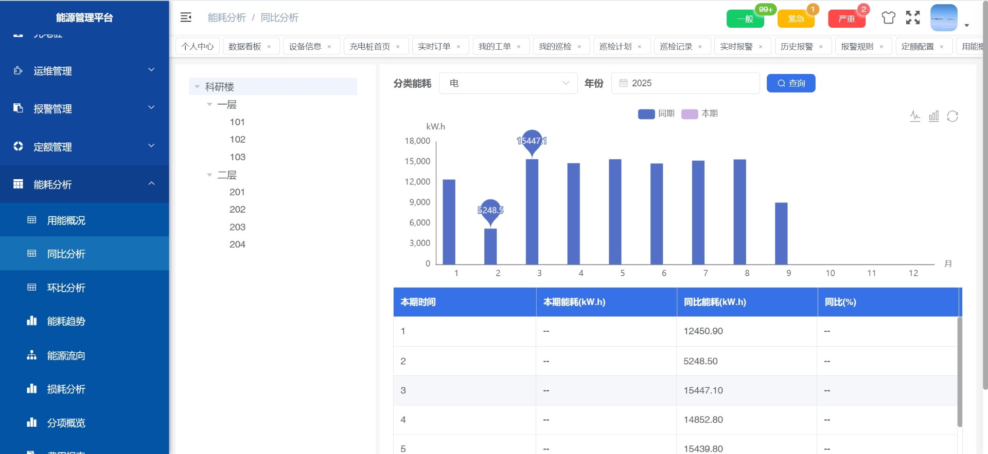 支持能耗总览、同比环比分析、趋势曲线绘制以及分项用能统计(如照明、空调、动力用电),帮助企业精准识别节能潜力点。