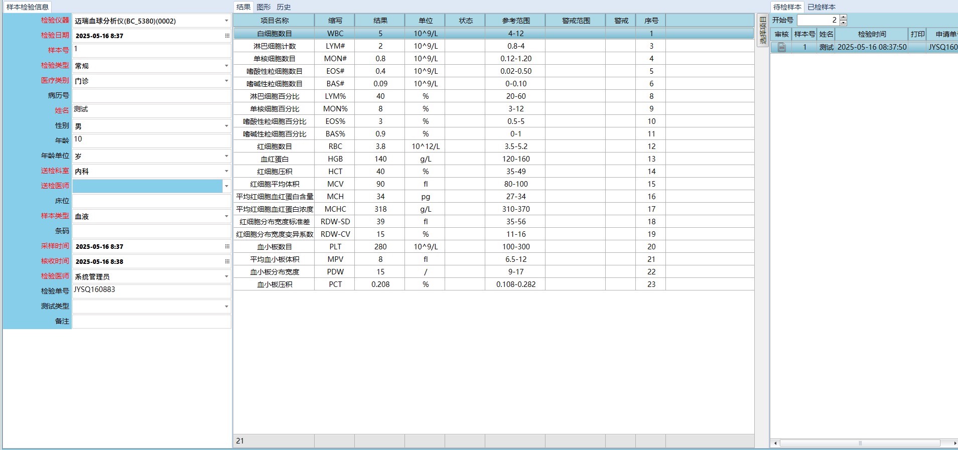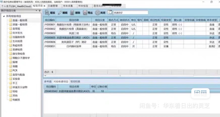 系统集成了完整的医学检验业务流程管理功能,涵盖科室配置、人员权限控制、检验项目定义、样本采集规范、实验设备对接等多个维度,助力医院实现检验科数字化转型。