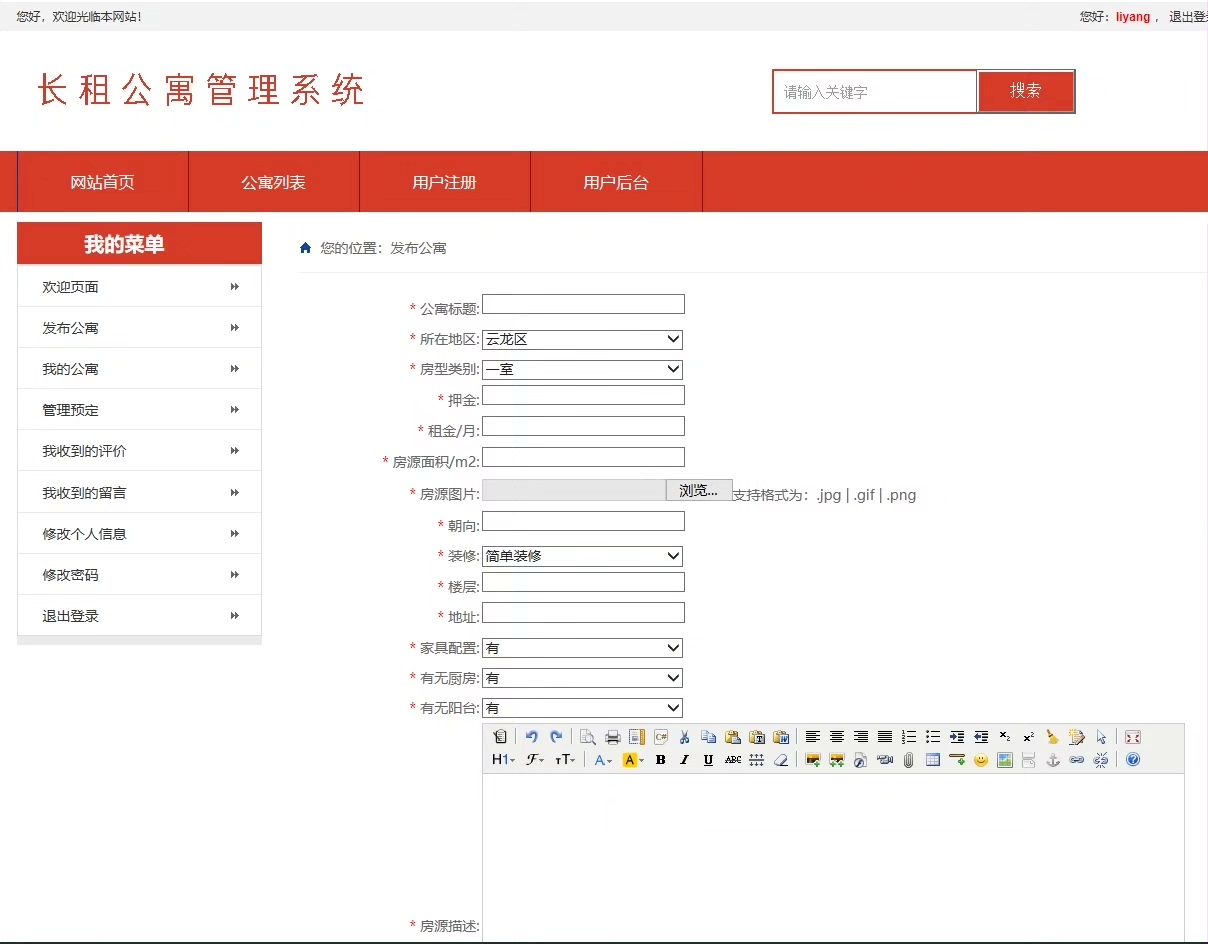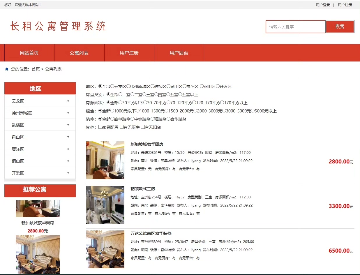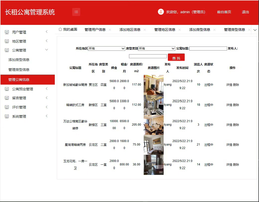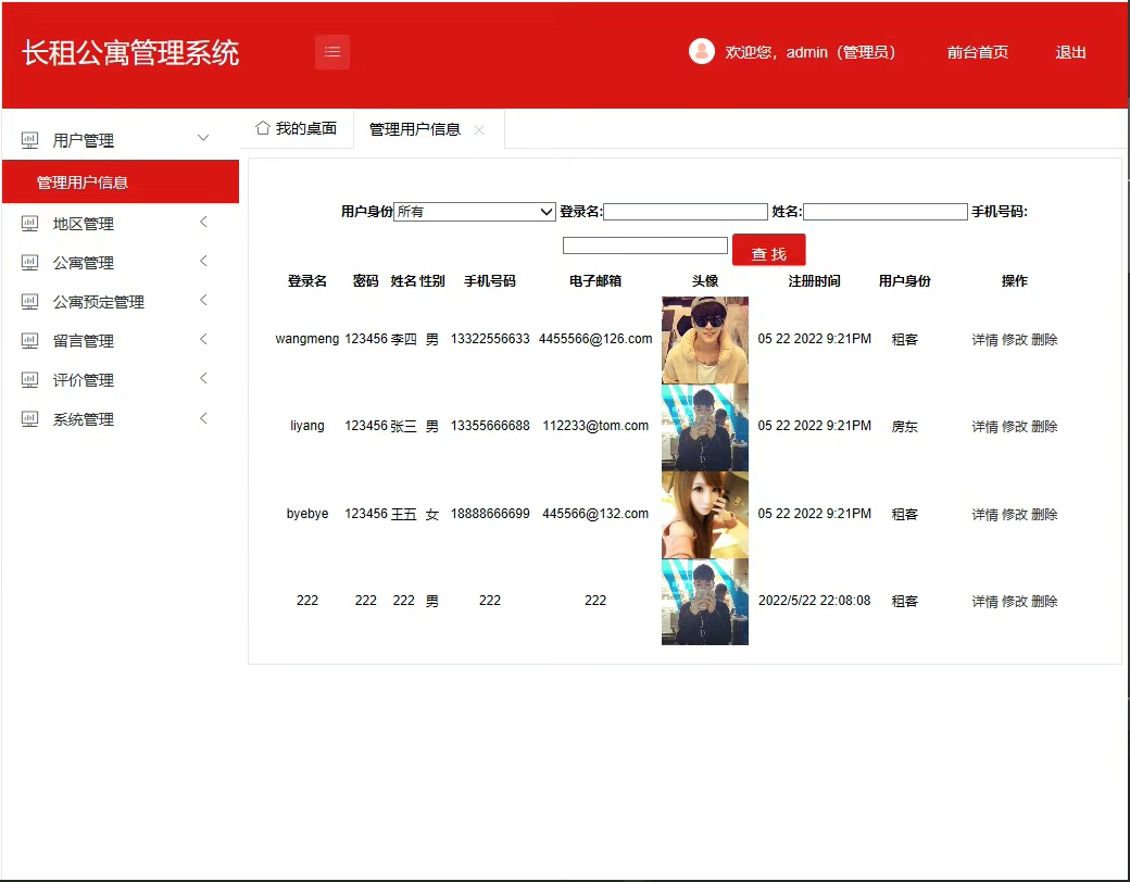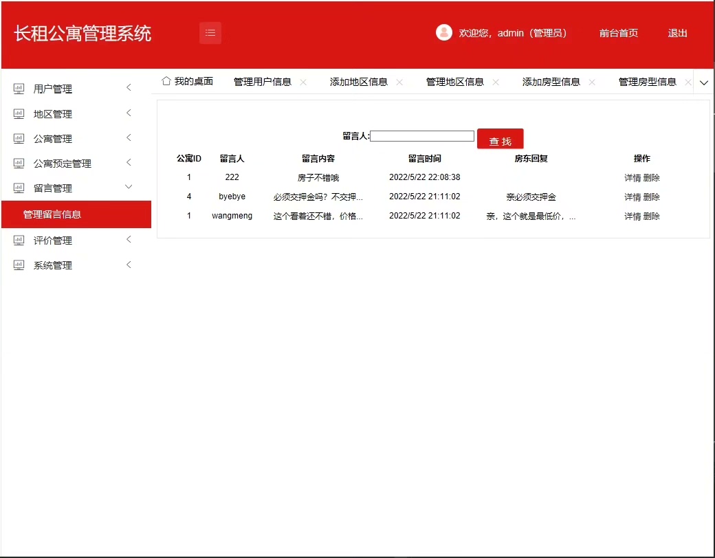 普通用户可完成注册登录、浏览全部房源信息、在线留言互动等操作;房东用户具备发布房源、编辑房屋信息、审核留言等权限;后台管理员则可对用户数据、地区分类、评论内容等进行统一管理,确保系统运行有序、信息真实可靠。