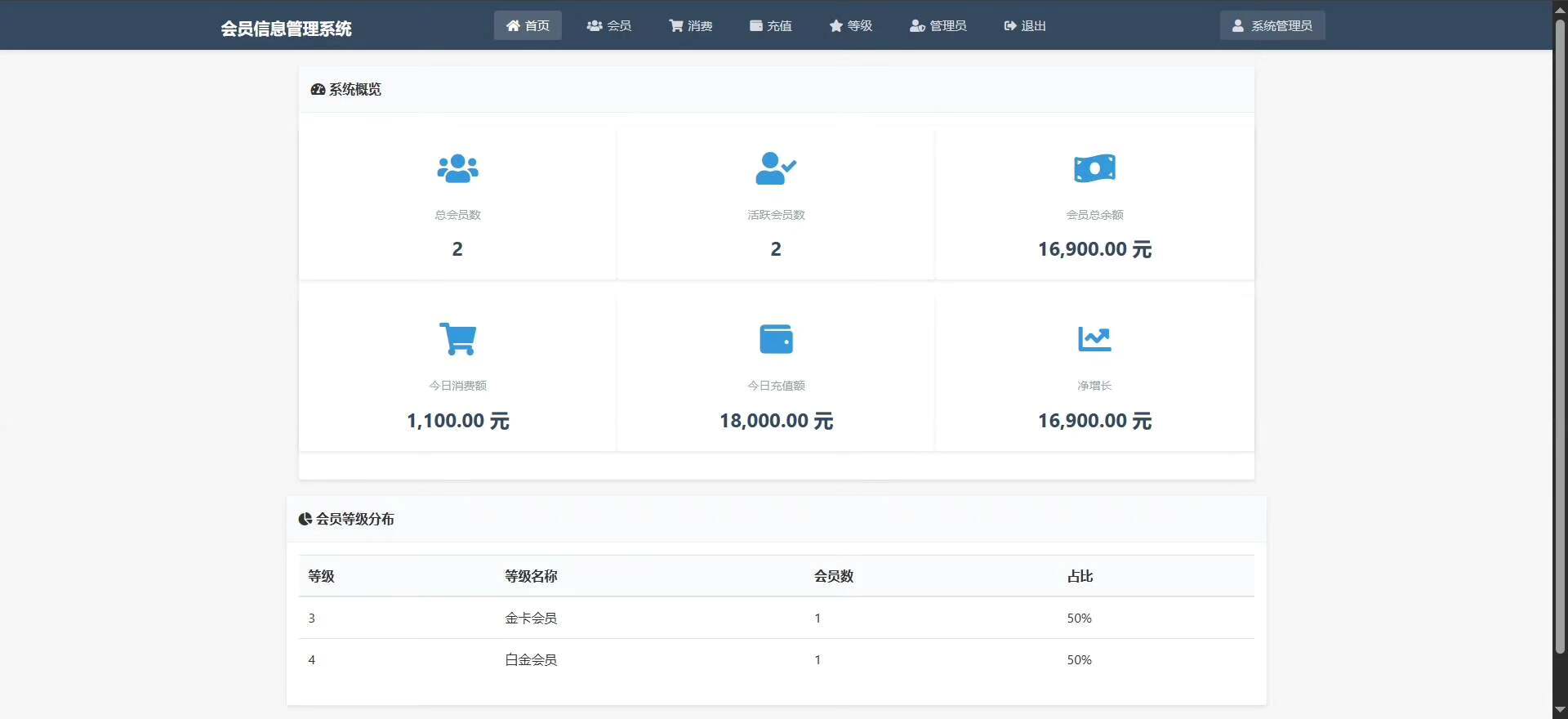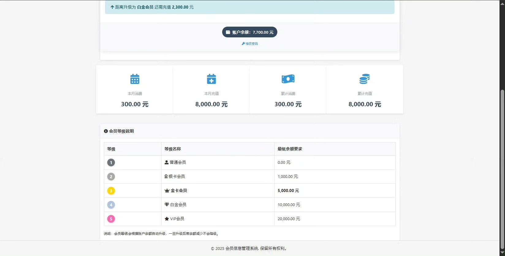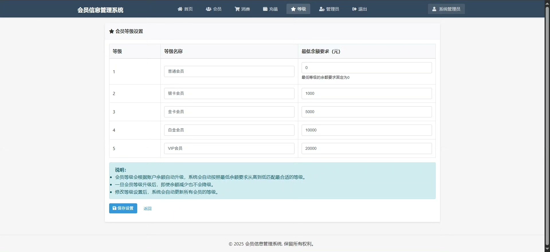 管理员可通过后台完成添加、账户充值、消费记录登记、等级配置以及子管理员账号创建等操作,全面掌控用户数据与资金流动。