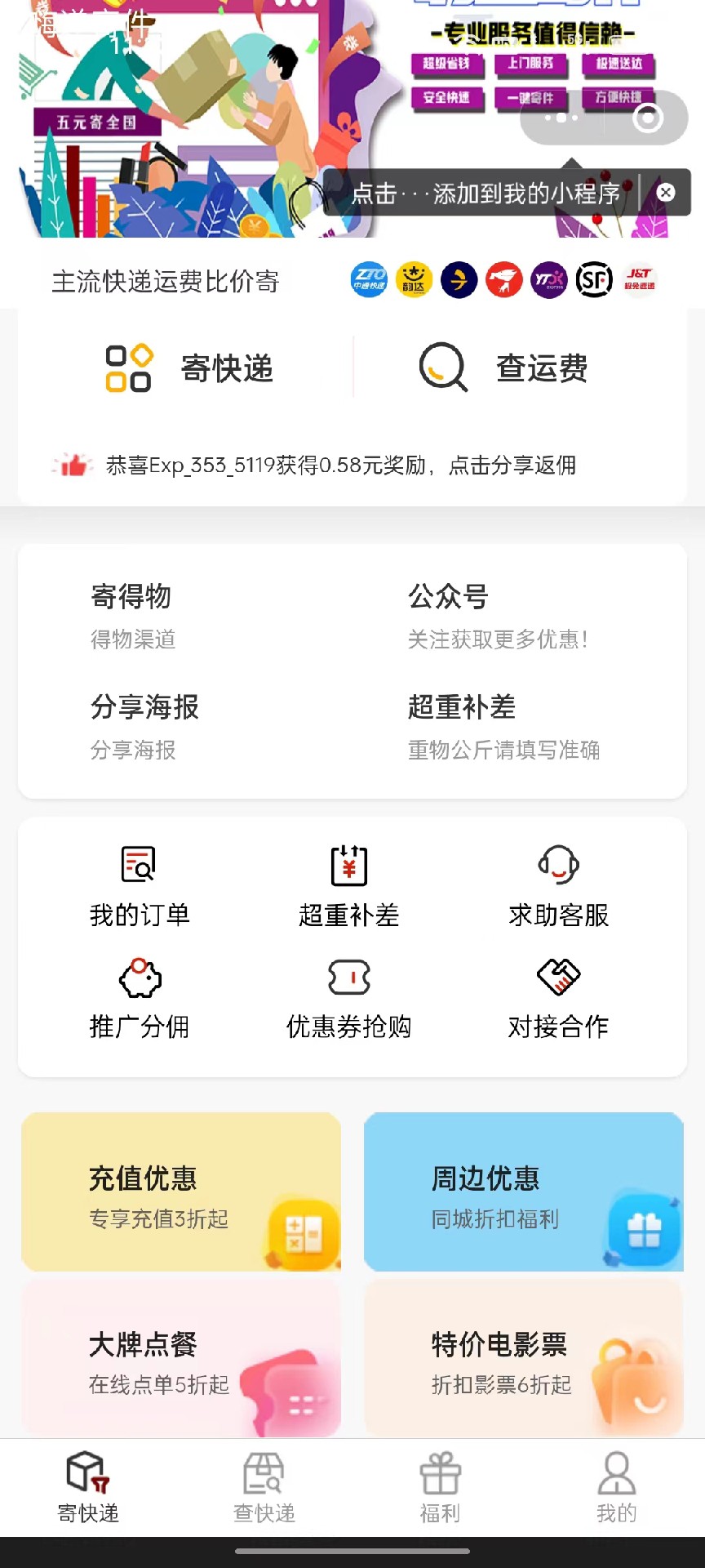 在原有快递业务基础上,扩展接入话费充值、电费缴纳、电影票购买、同城服务等多种高频率生活类CPS合作渠道,用户消费即可产生分佣收入。