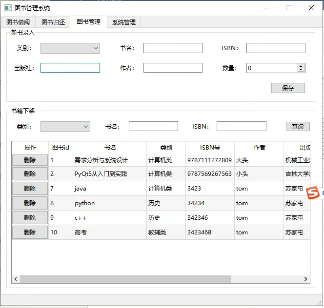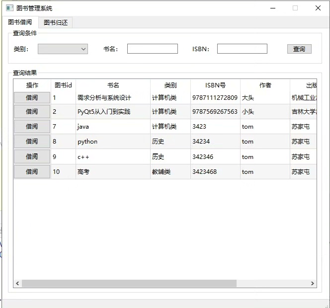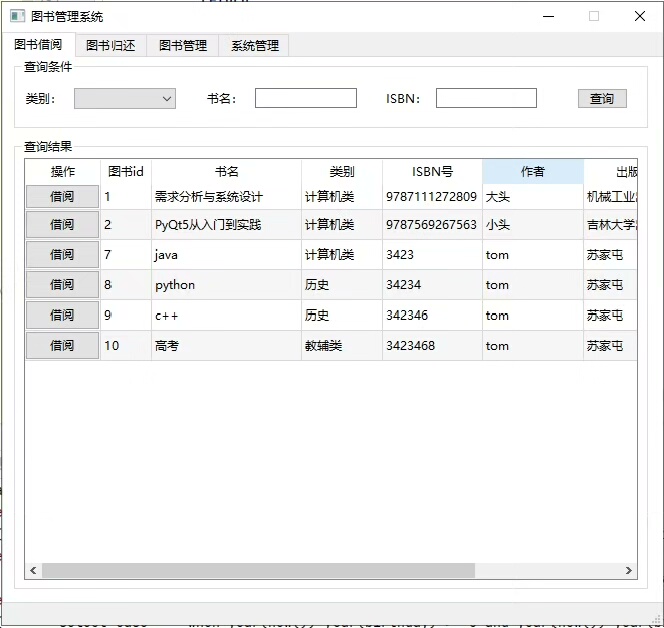 本图书管理系统采用PyQt5作为图形界面开发框架,结合MySQL数据库进行数据存储,后端逻辑使用Python3.6编写,整体结构清晰,适合学习桌面应用程序开发与数据库交互。