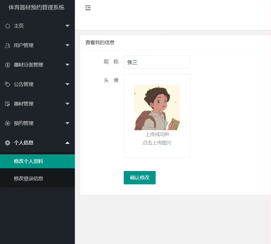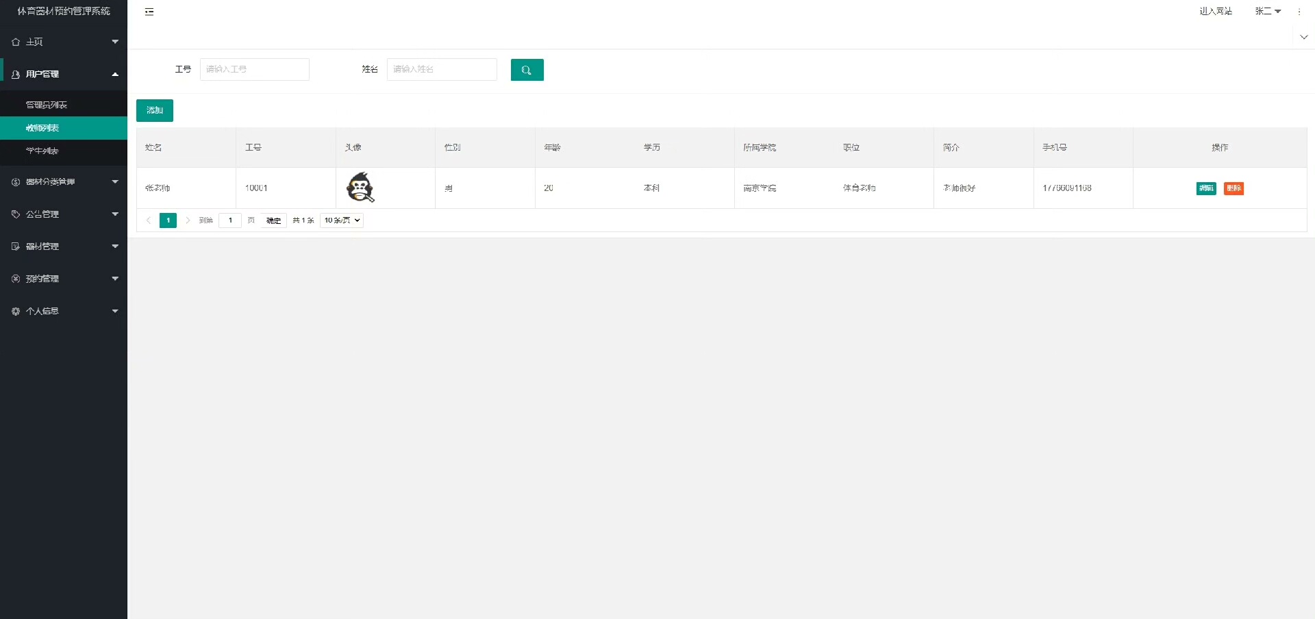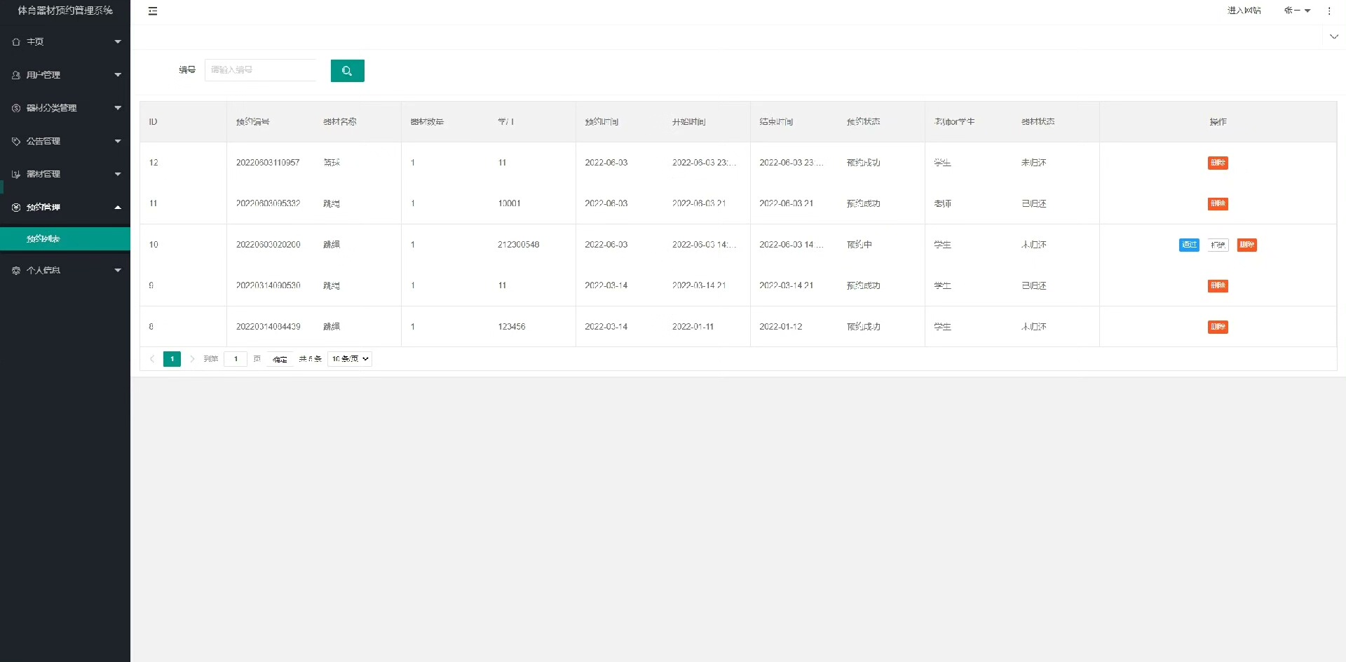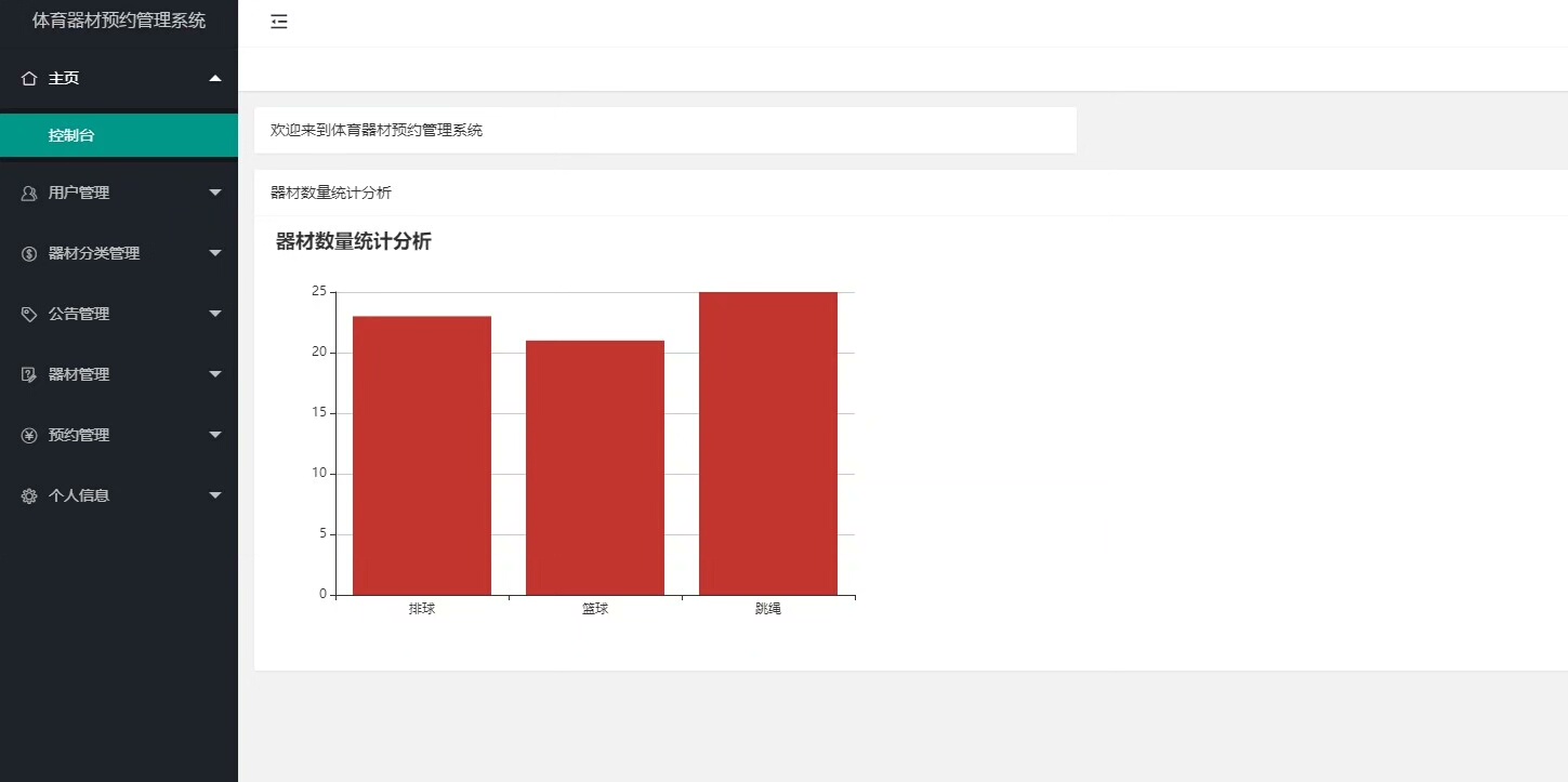 管理员拥有最高权限,涵盖用户信息管理、体育器材分类设置、器材增删改查、预约订单审核、公告发布以及数据统计分析等功能,全面掌控系统运行状态。