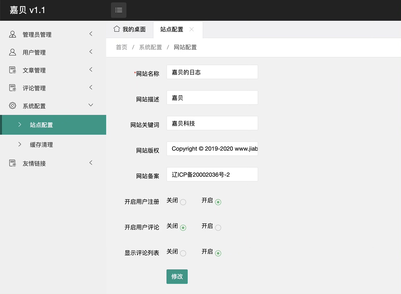 通过系统配置模块,可自定义网站名称、关键词、描述等SEO信息,并灵活控制用户是否可注册或登录,满足不同场景需求。