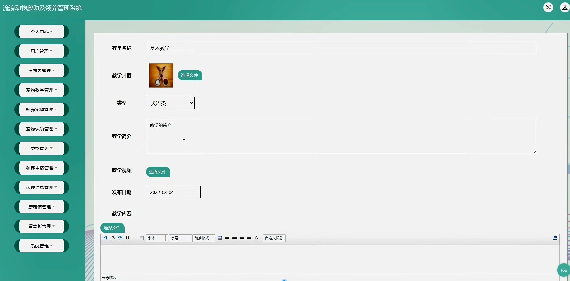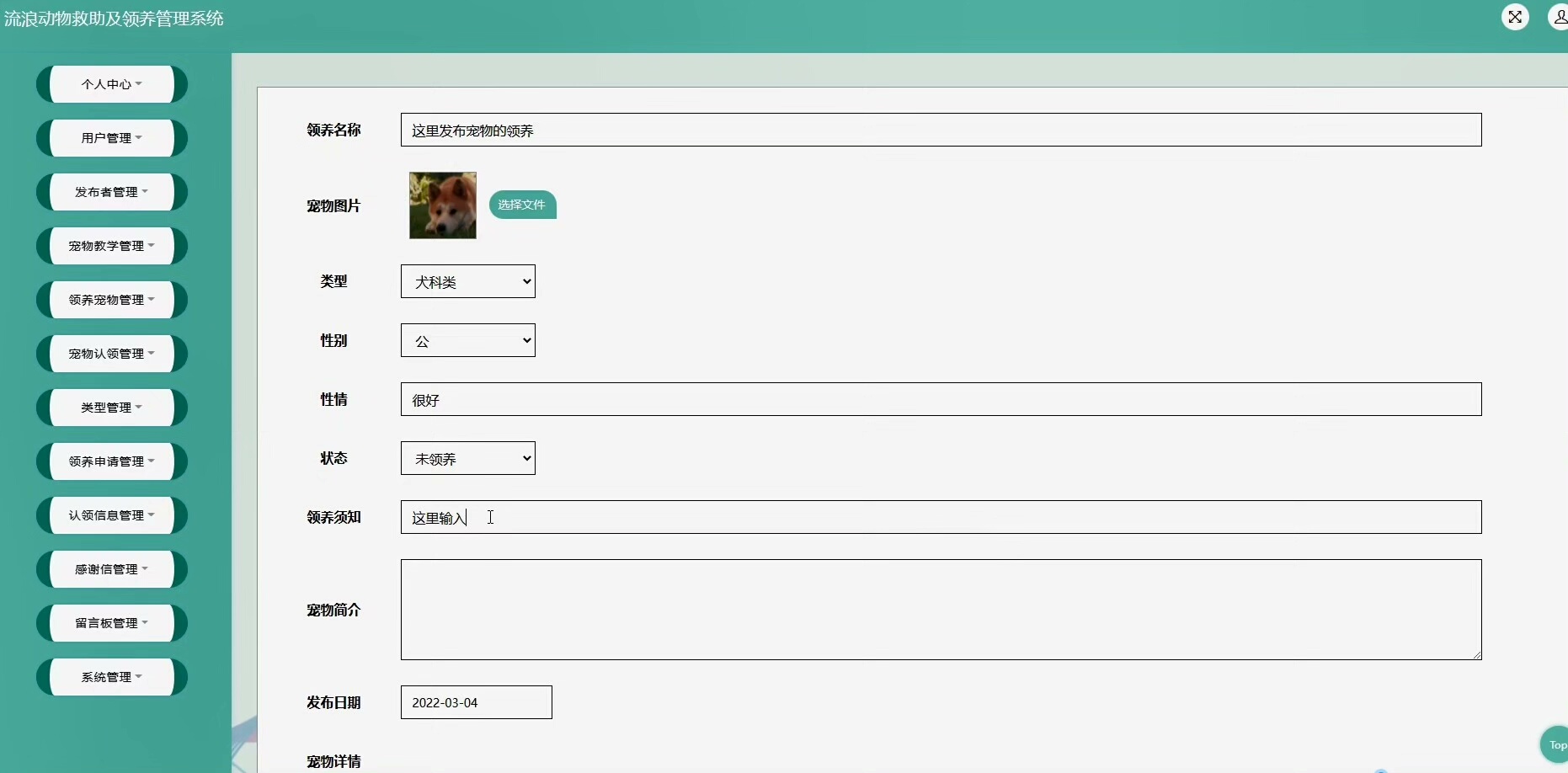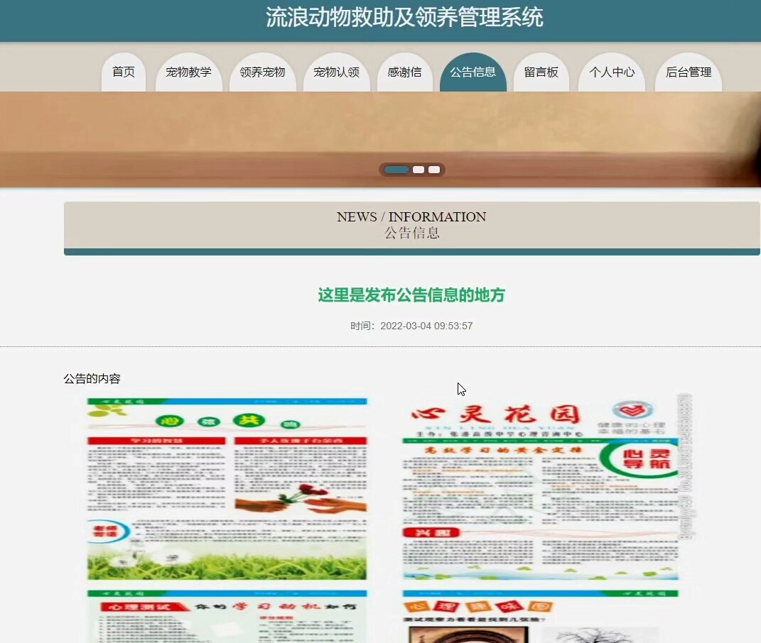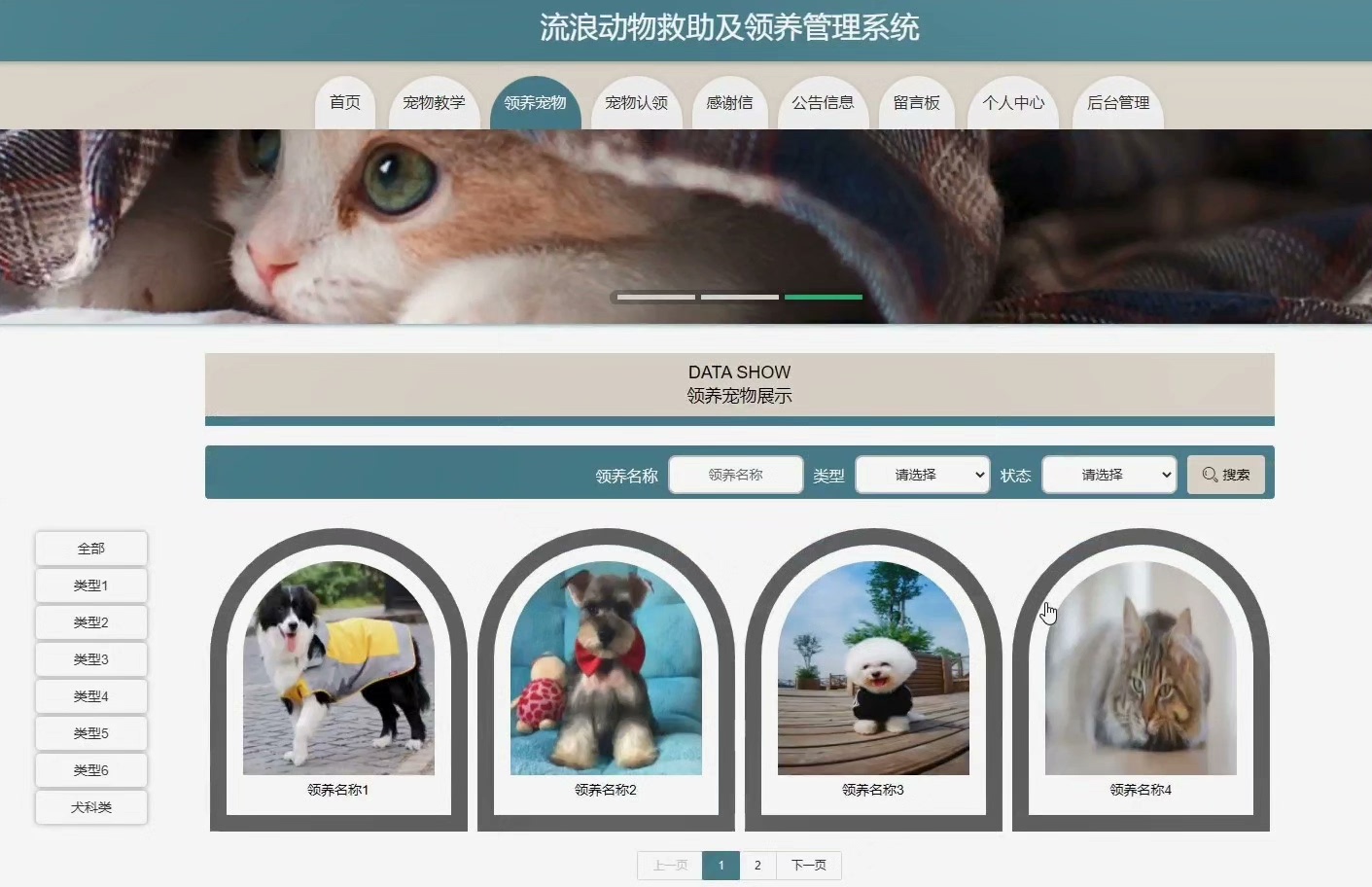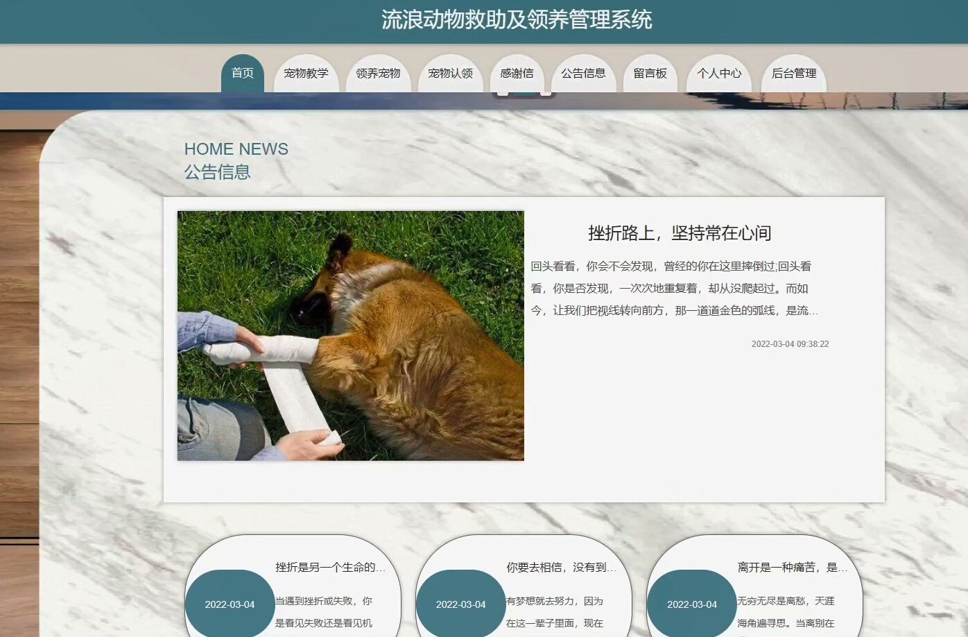 本系统是一款基于SSM(Spring+SpringMVC+MyBatis)框架开发的流浪动物救助及领养管理Web应用,采用Java语言、JSP页面技术构建,属于典型的JavaEE企业级项目。