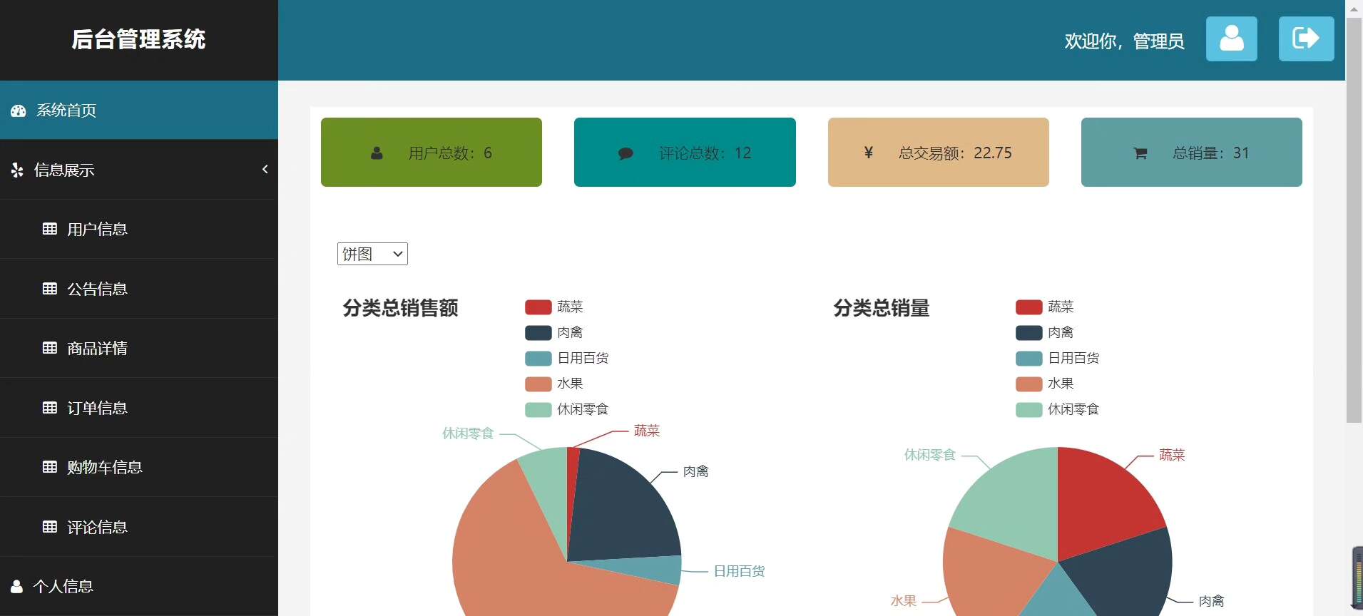 后台管理功能:管理员可查看数据统计图表(饼图/扇形图),并对用户信息、商品类目、车记录、订单详情、平台公告、评论内容及个人资料进行全面管理。