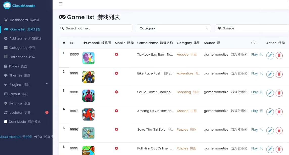 配备简洁高效的后台管理系统,支持游戏库管理、主题切换、参数设置和数据统计查看。
