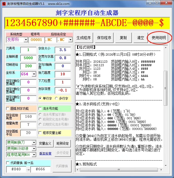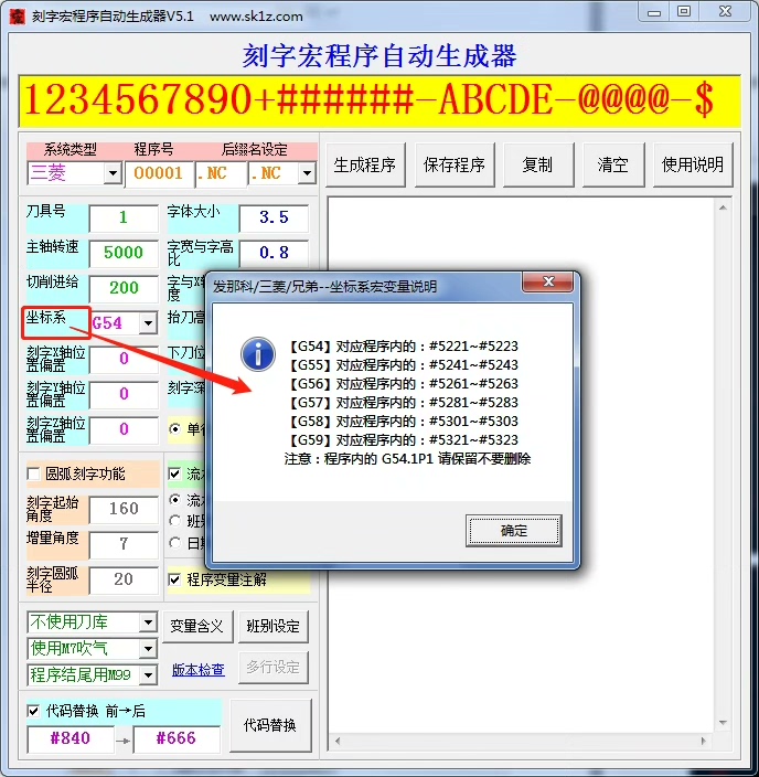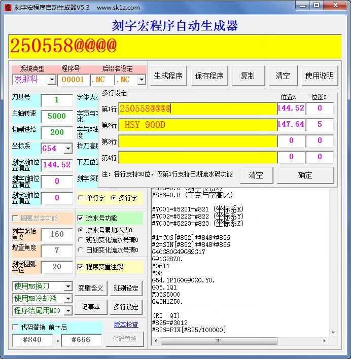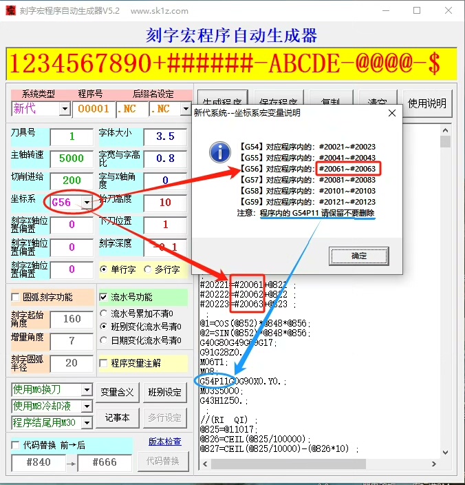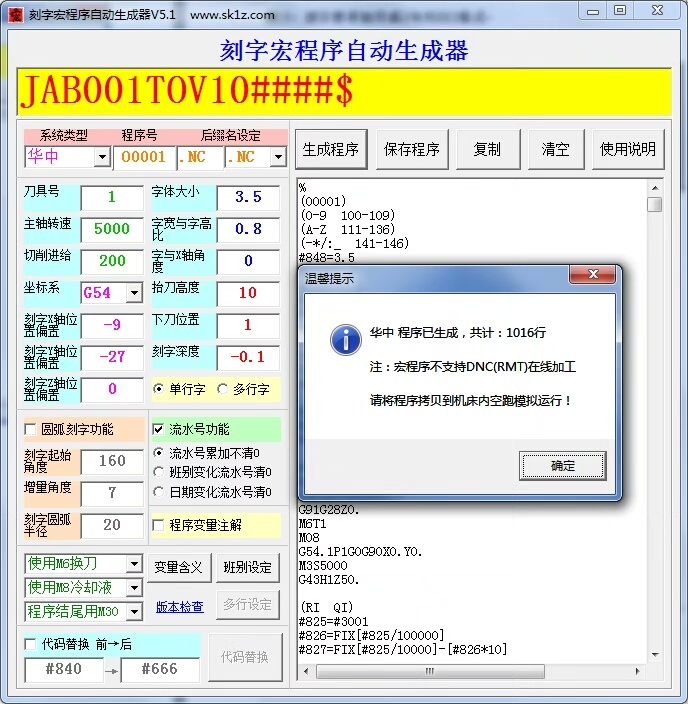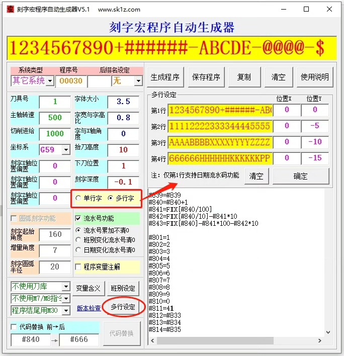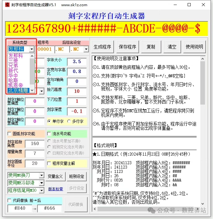 该刻字宏程序可实现单行最多30位字符的雕刻输出,涵盖数字0-9、英文字母A-Z(不区分大小写),以及常用符号如+-*/:_等,满足多样化标记需求。