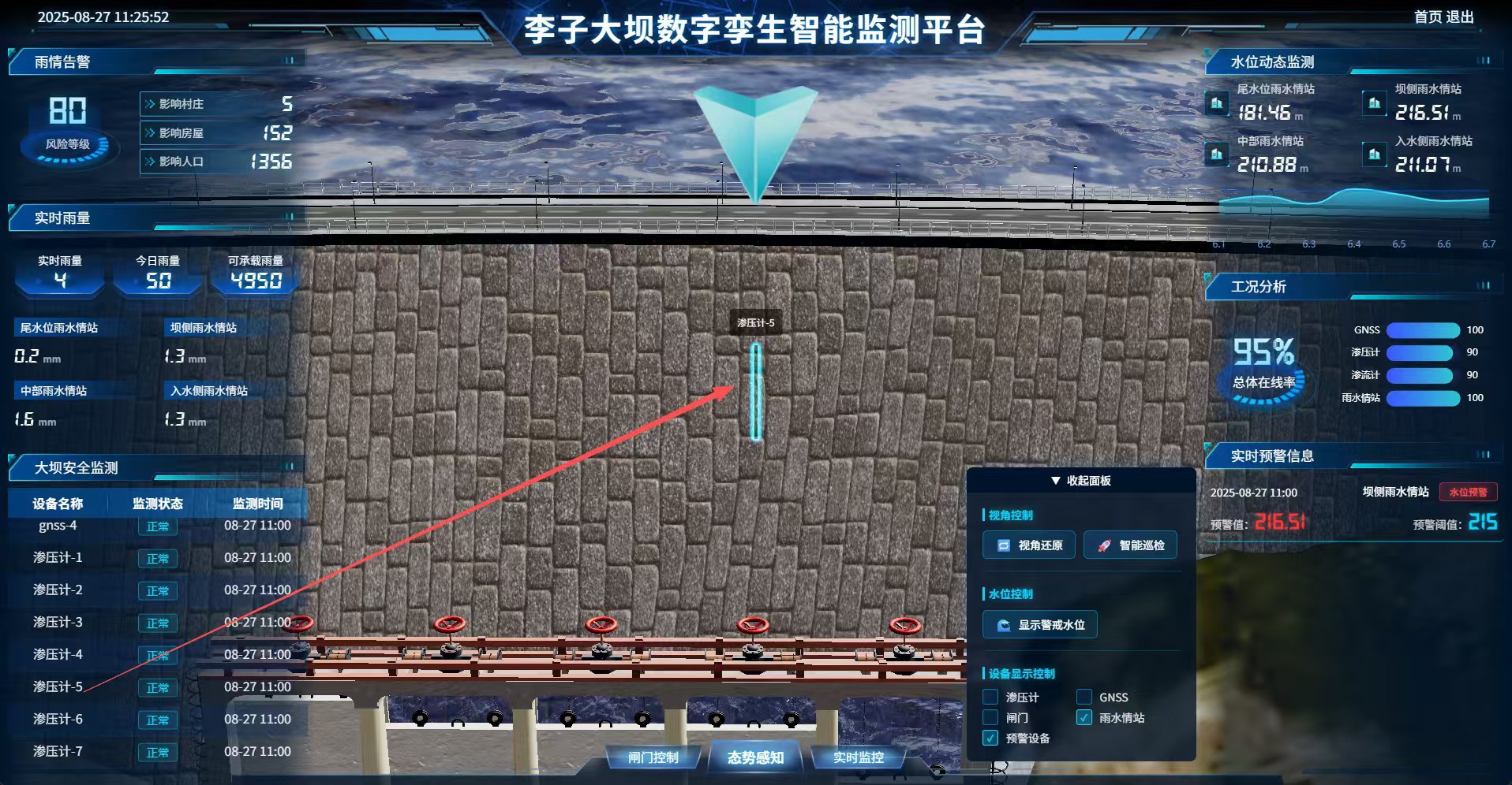 全方位实时监测:集成闸门运行状态、降雨量与水位变化等关键参数监控,GNSS位移及渗压计数据通过弹窗快速查看。