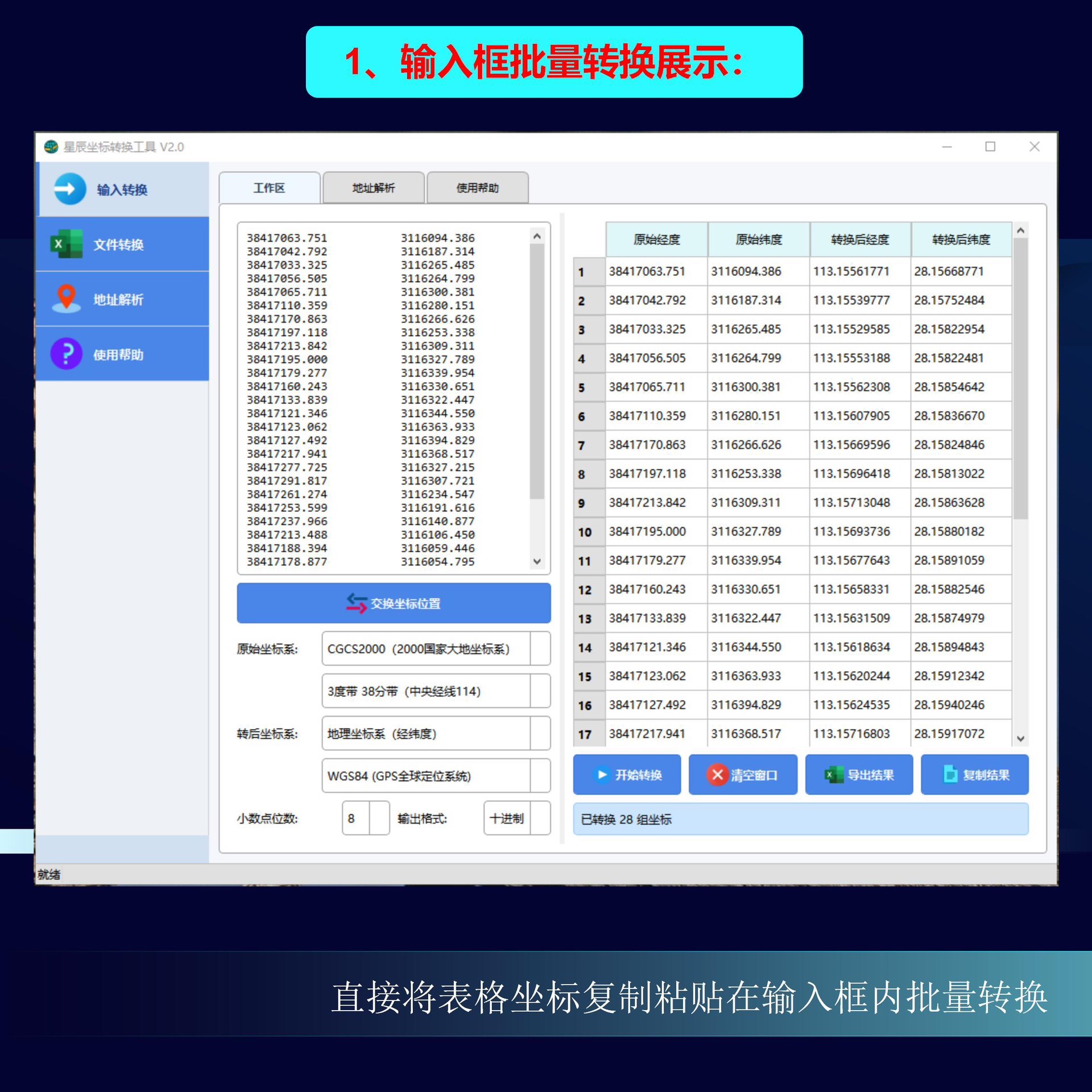 采用优化算法引擎,转换过程高速流畅,支持百万级坐标点批量处理。