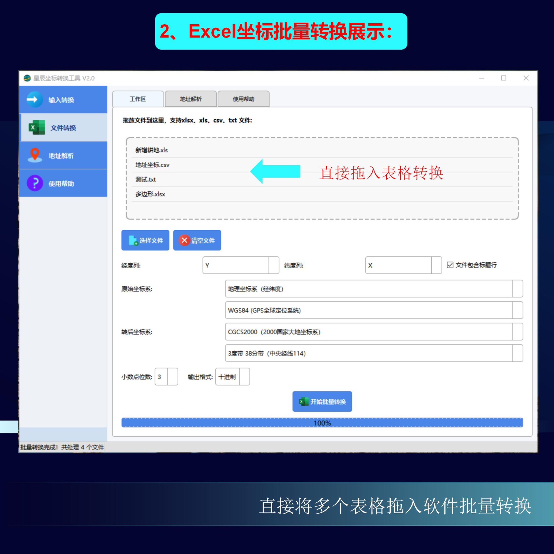 用户可通过界面输入框手动录入坐标进行单点转换,也可直接将包含坐标的Excel文件一键拖入软件,系统自动识别并完成批量处理。