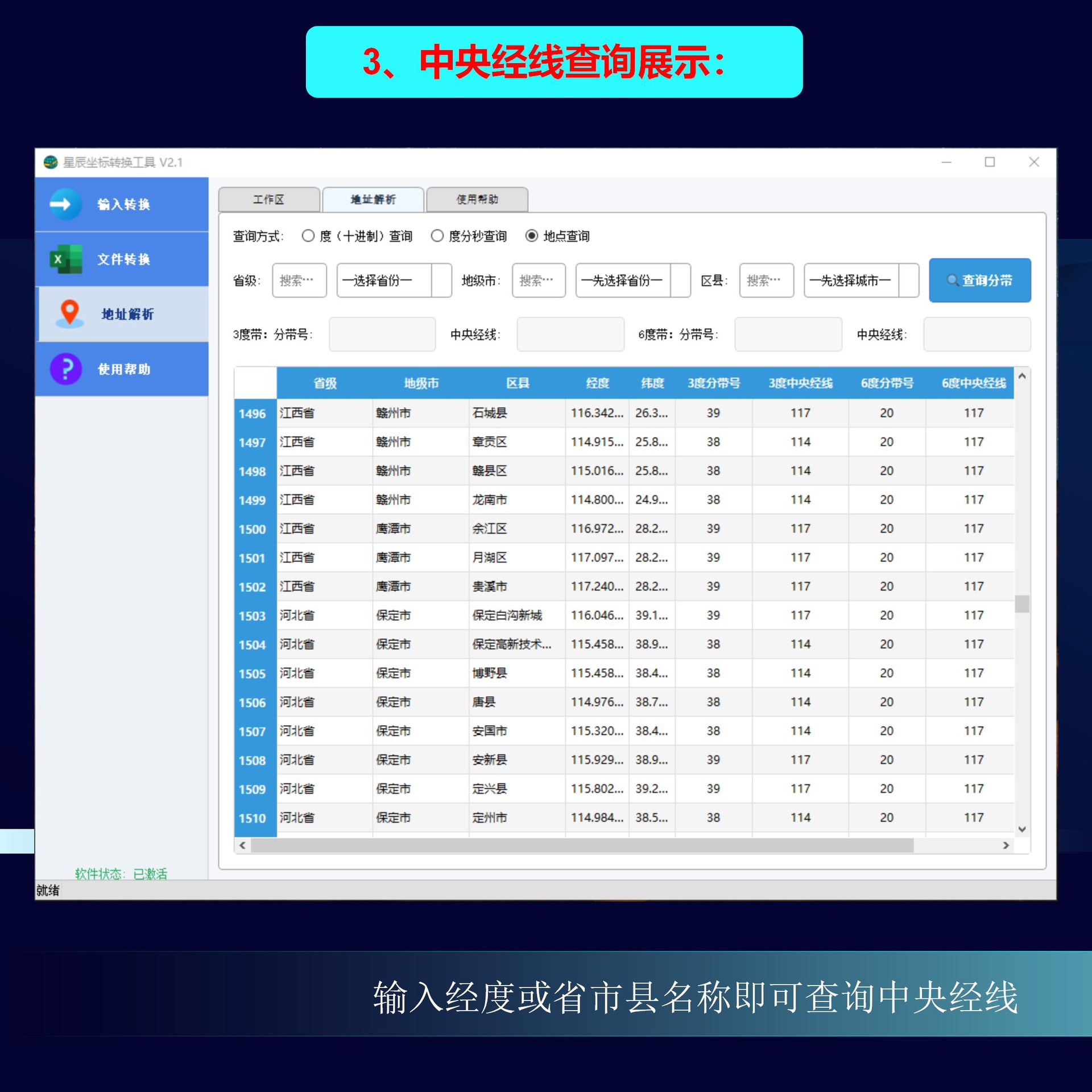 同时提供中央经线查询功能,用户可根据所在区域自动获取推荐中央子午线,提升投影精度。