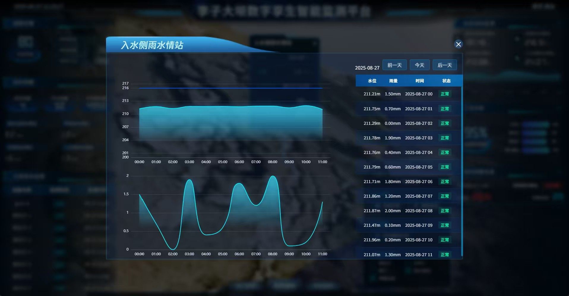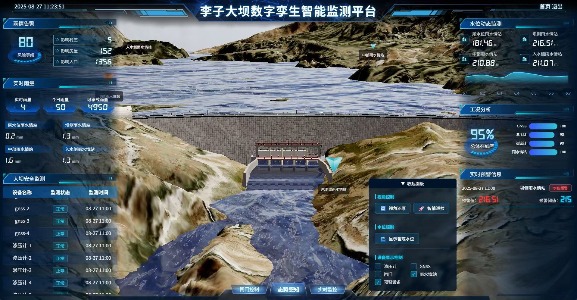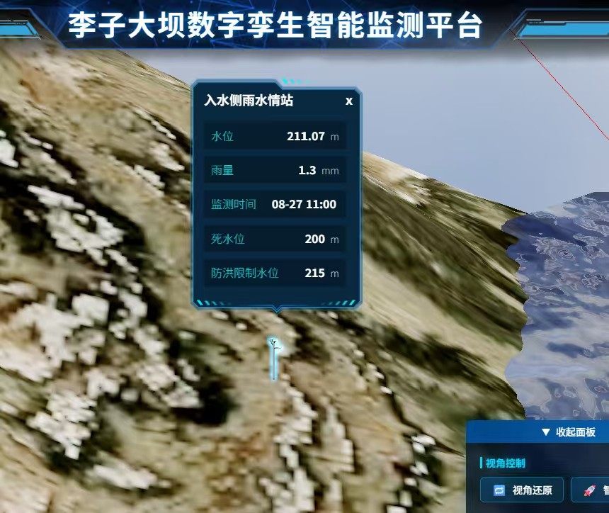 - **全维度监测覆盖**:集成闸门启闭控制面板、雨量/水位动态曲线图、GNSS位移监测点与渗压计数据弹窗查询,关键参数秒级响应、一触即达。