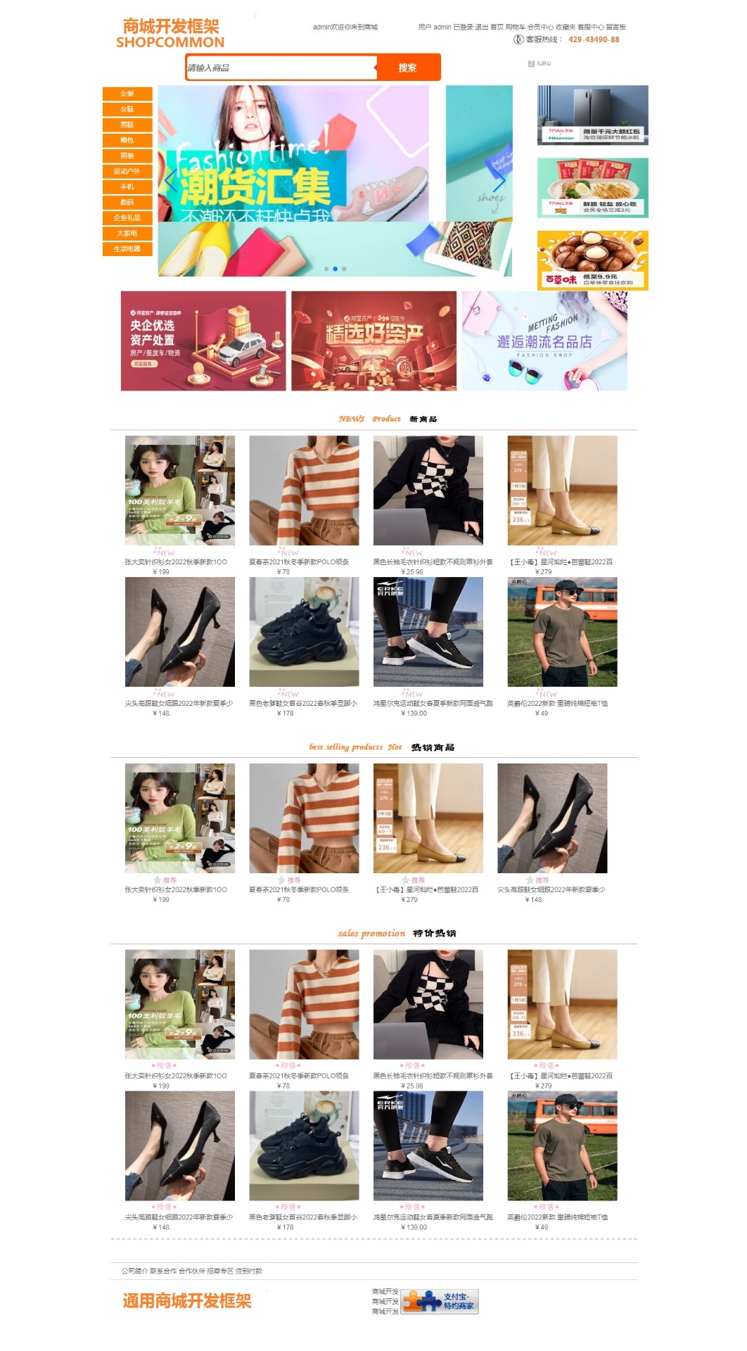 3. **首页门户**:集成焦点轮播图、热销商品推荐、广告位展示及全局搜索入口;