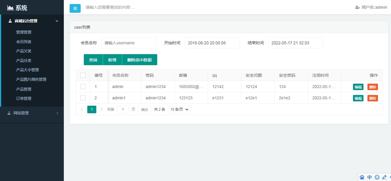 1. **管理员权限体系**:支持管理员账号增删改查及角色权限配置;