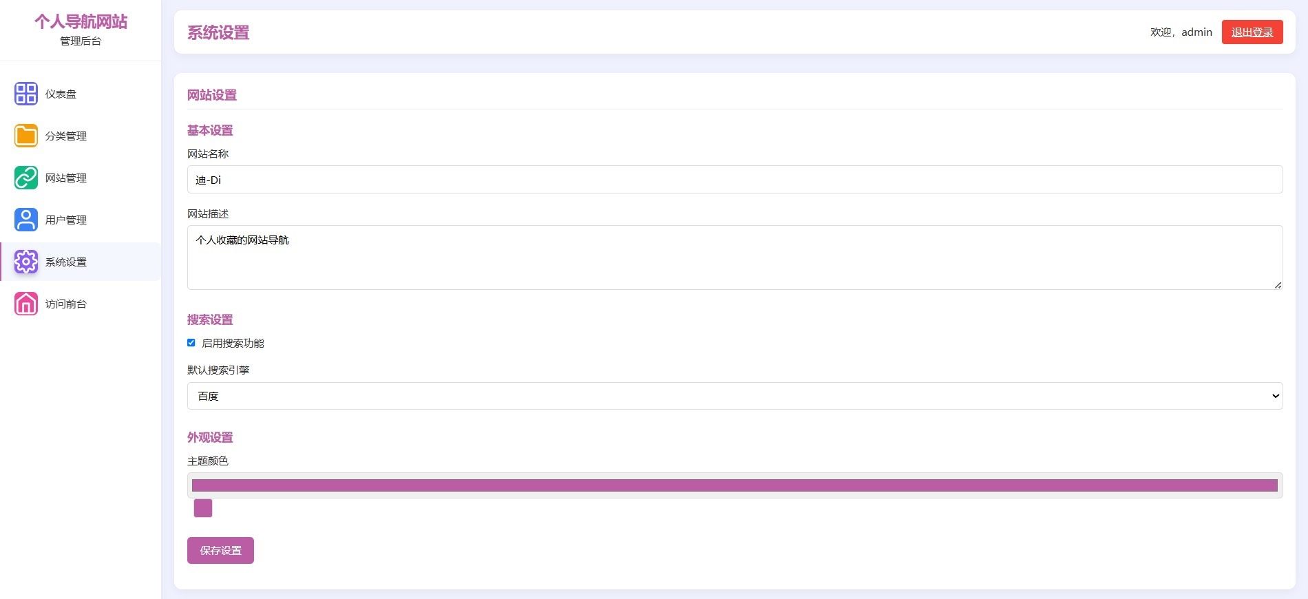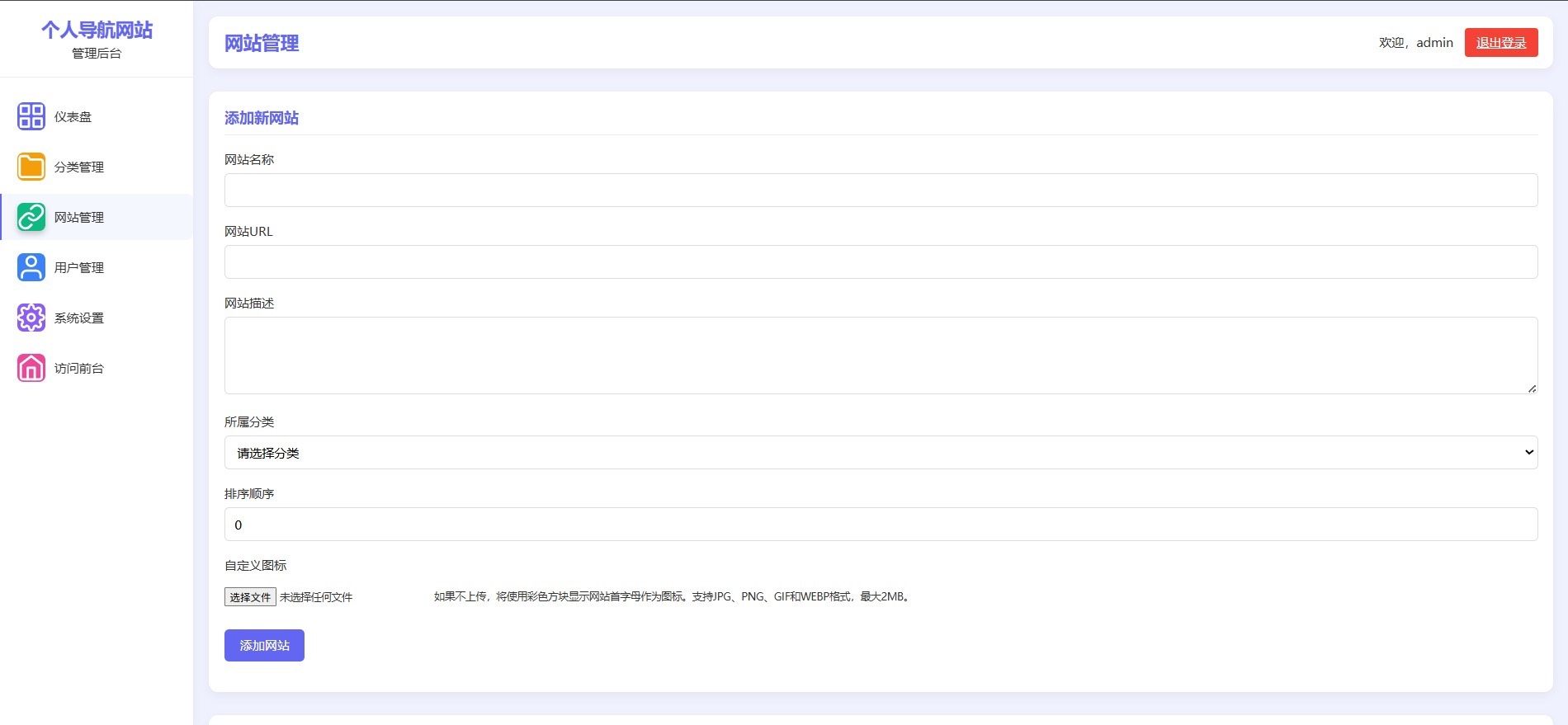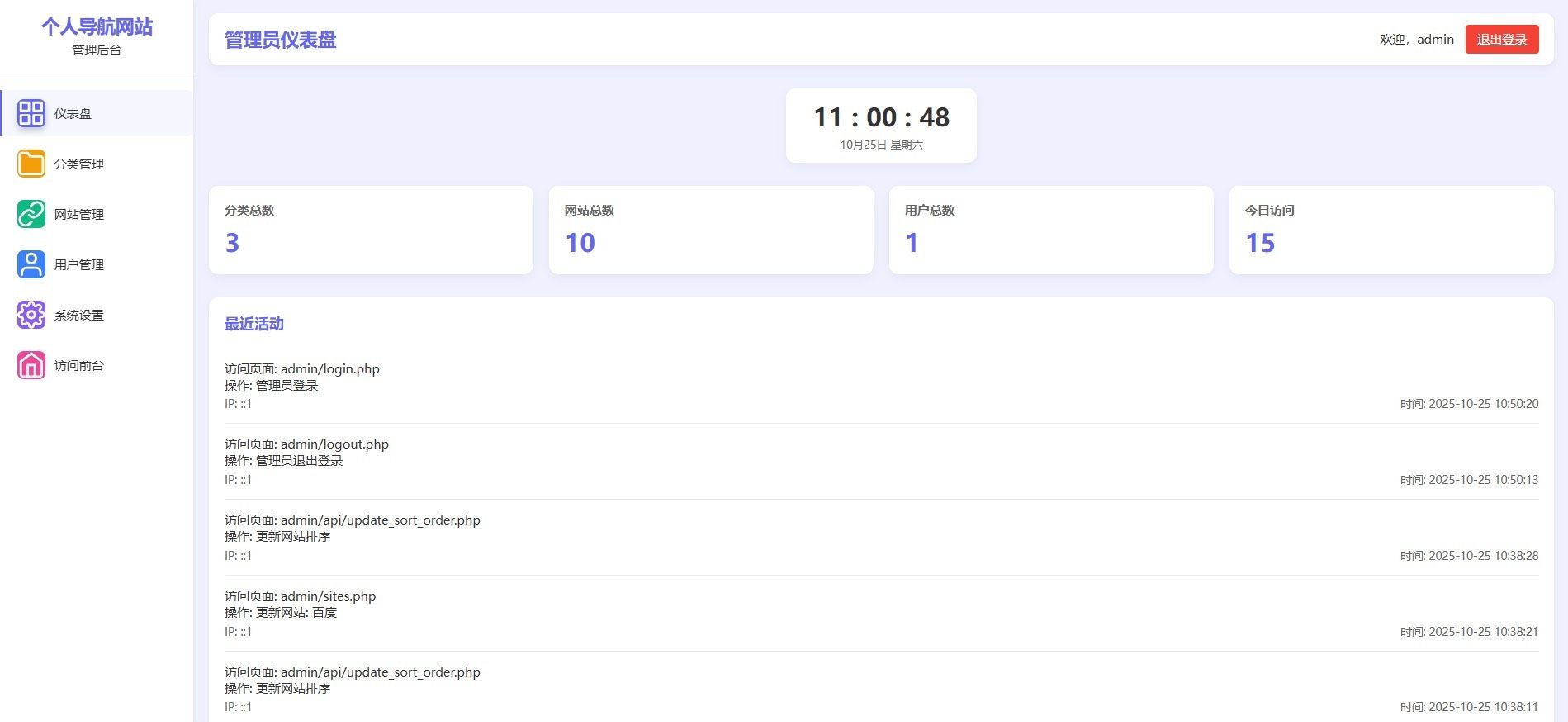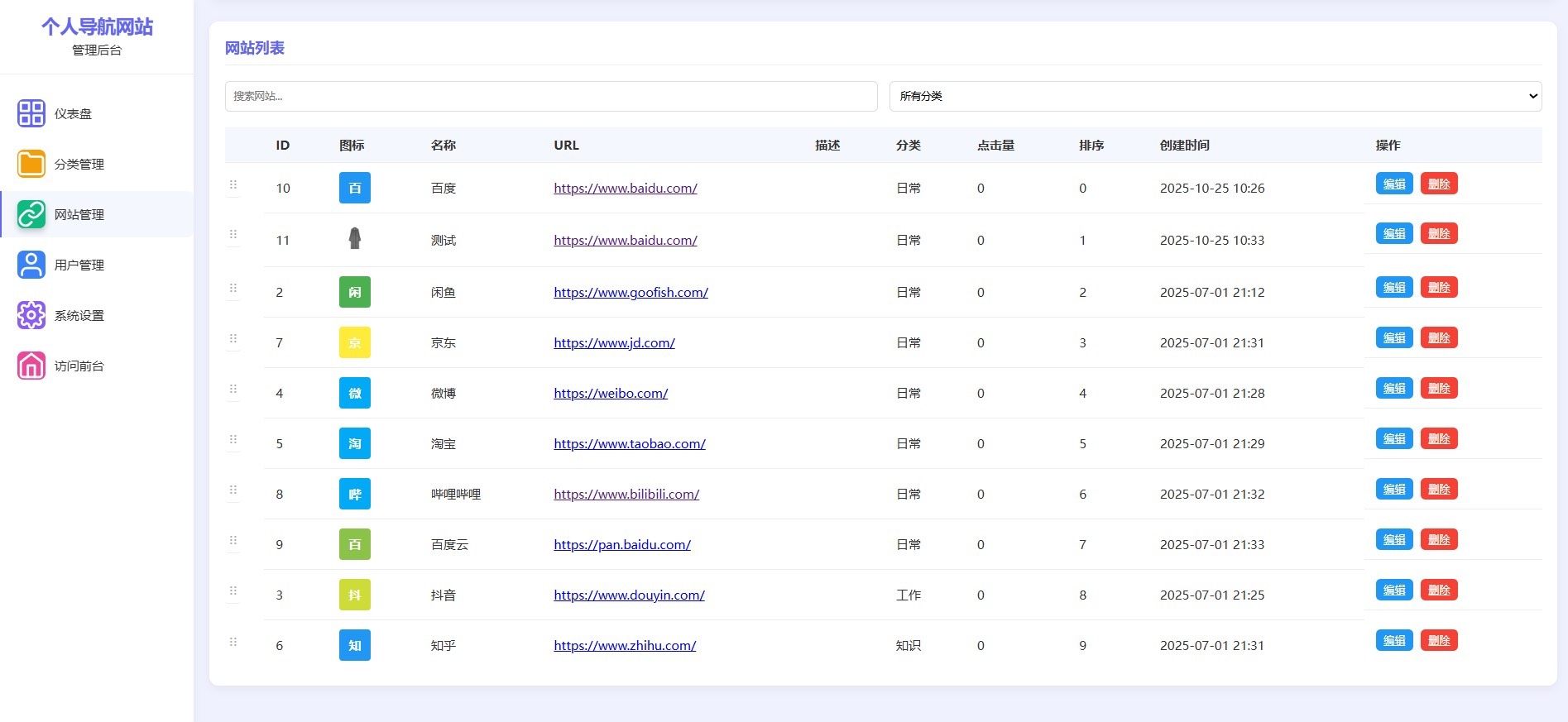 内置完整的URL增删改查(CRUD)操作,配备独立后台管理界面,支持分类管理、图标上传、排序调整、状态开关等实用功能,全部为个人原创开发,代码结构清晰、注释完善。