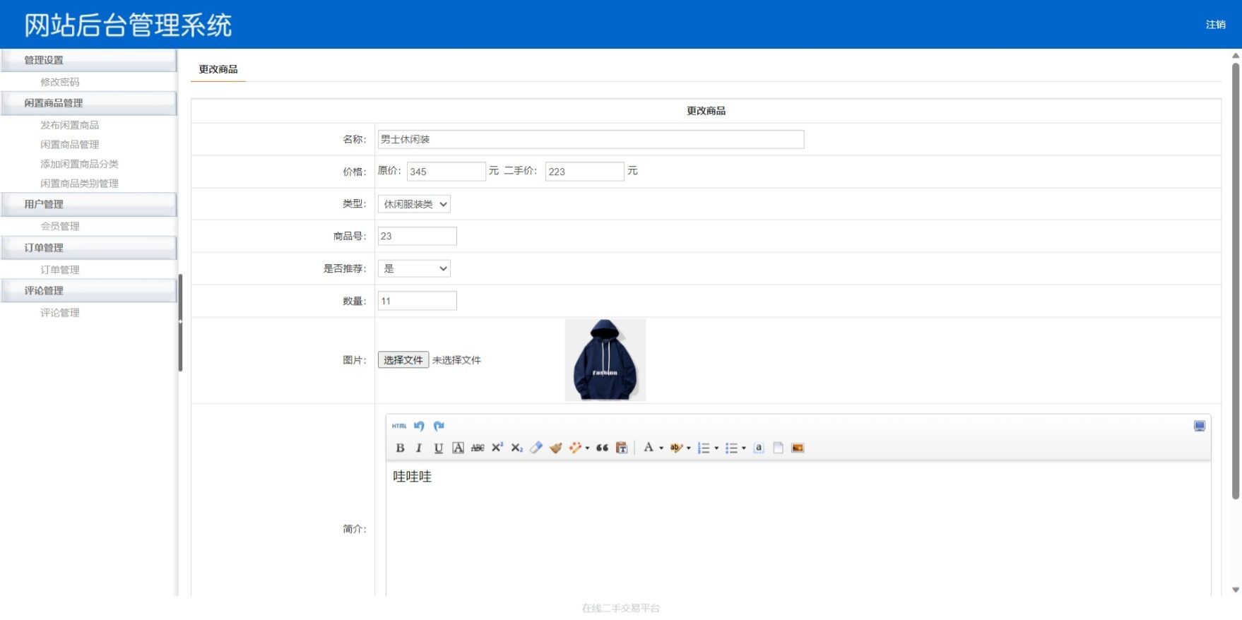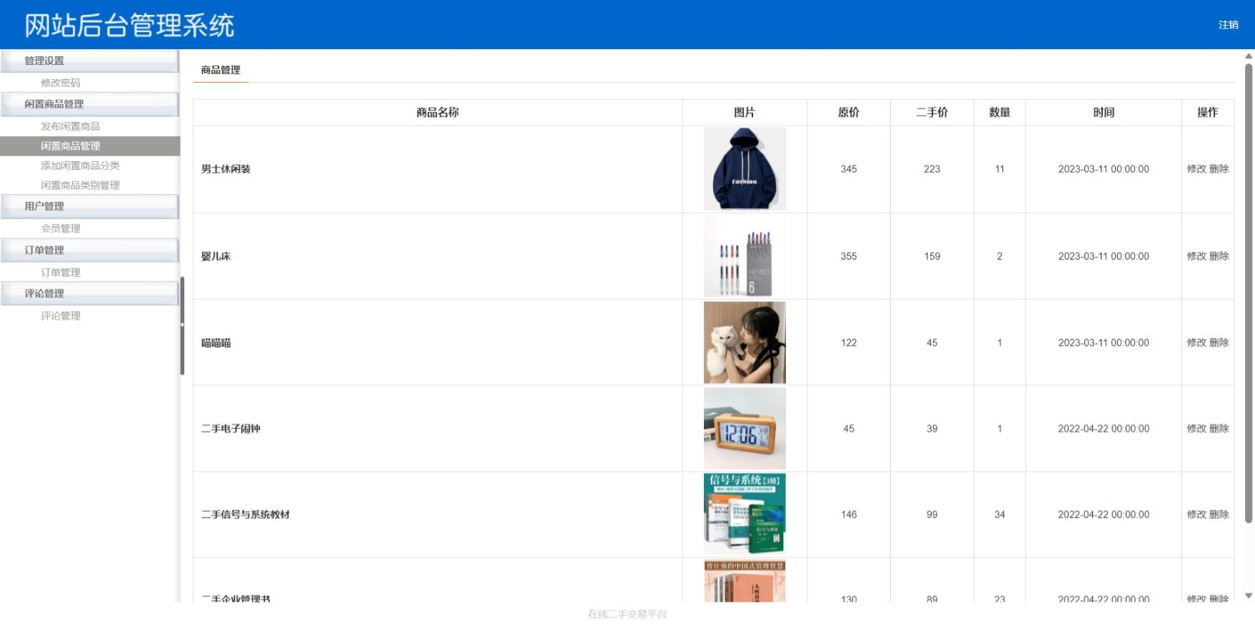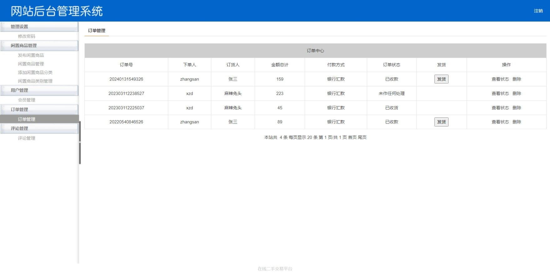 管理员拥有全流程管控权限:可自主发布闲置商品并进行上下架、编辑、下线等全生命周期管理;支持无限级商品分类体系搭建与动态维护;对注册用户实施精细化运营,包括信息审核、信用评级与封禁;订单模块支持按状态(待/待发货/已签收等)筛选、手动标记发货、信息录入;评论管理支持审核、置顶、删除及敏感词过滤。