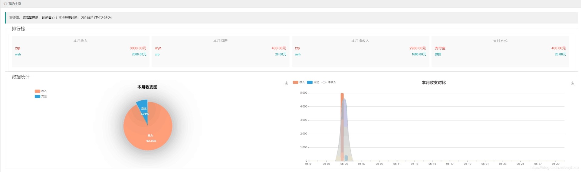 涵盖五大实用模块:【收支管理】支持按类别、时间、成员多维记账与快速查询;【账户总览】实时汇总银行卡、现金、电子钱包等多账户余额与变动趋势;【统计报表】内置柱状图、饼图等可视化图表,支持月度/年度收支分析与导出;【家庭成员管理】可添加多个成员并分配查看或编辑权限,保障隐私与协作并存;【系统管理】提供用户管理、角色权限配置、操作日志审计及基础参数设置。