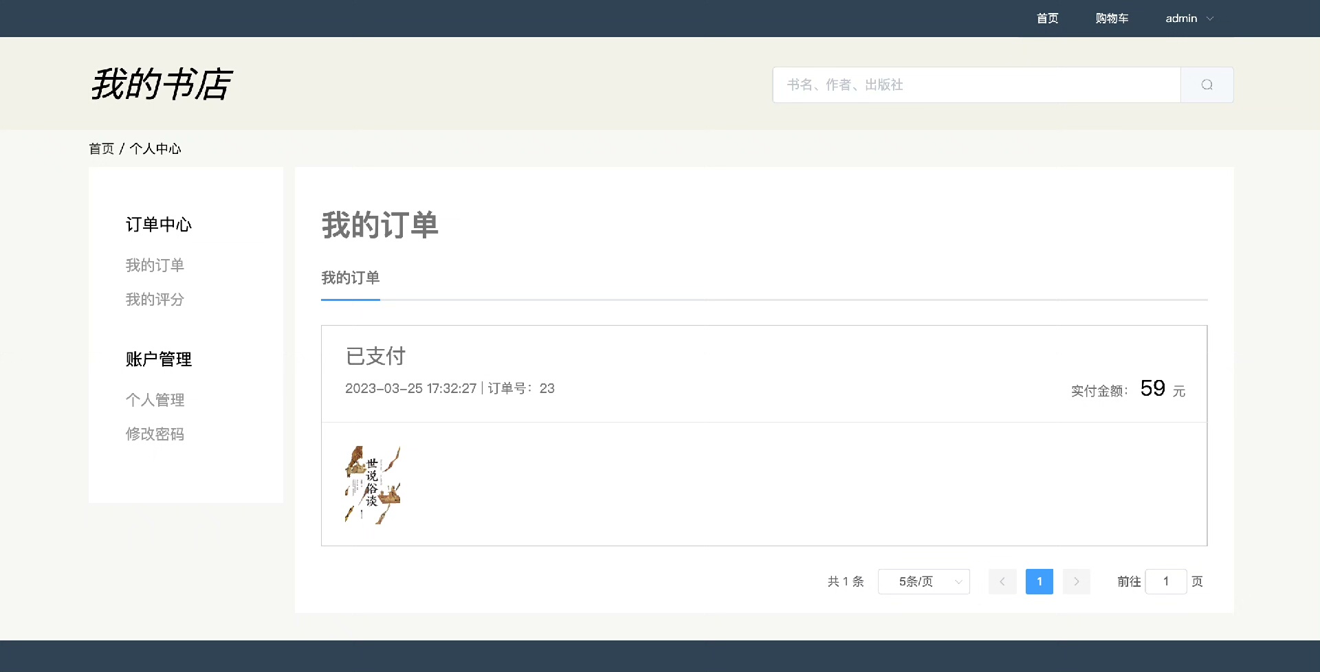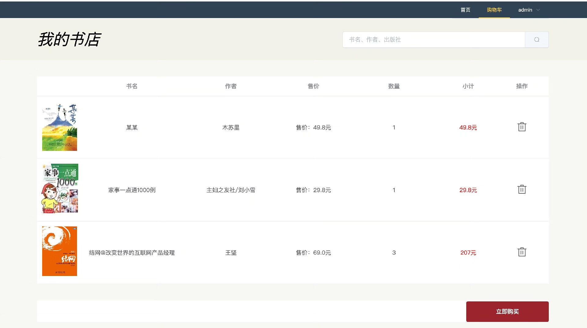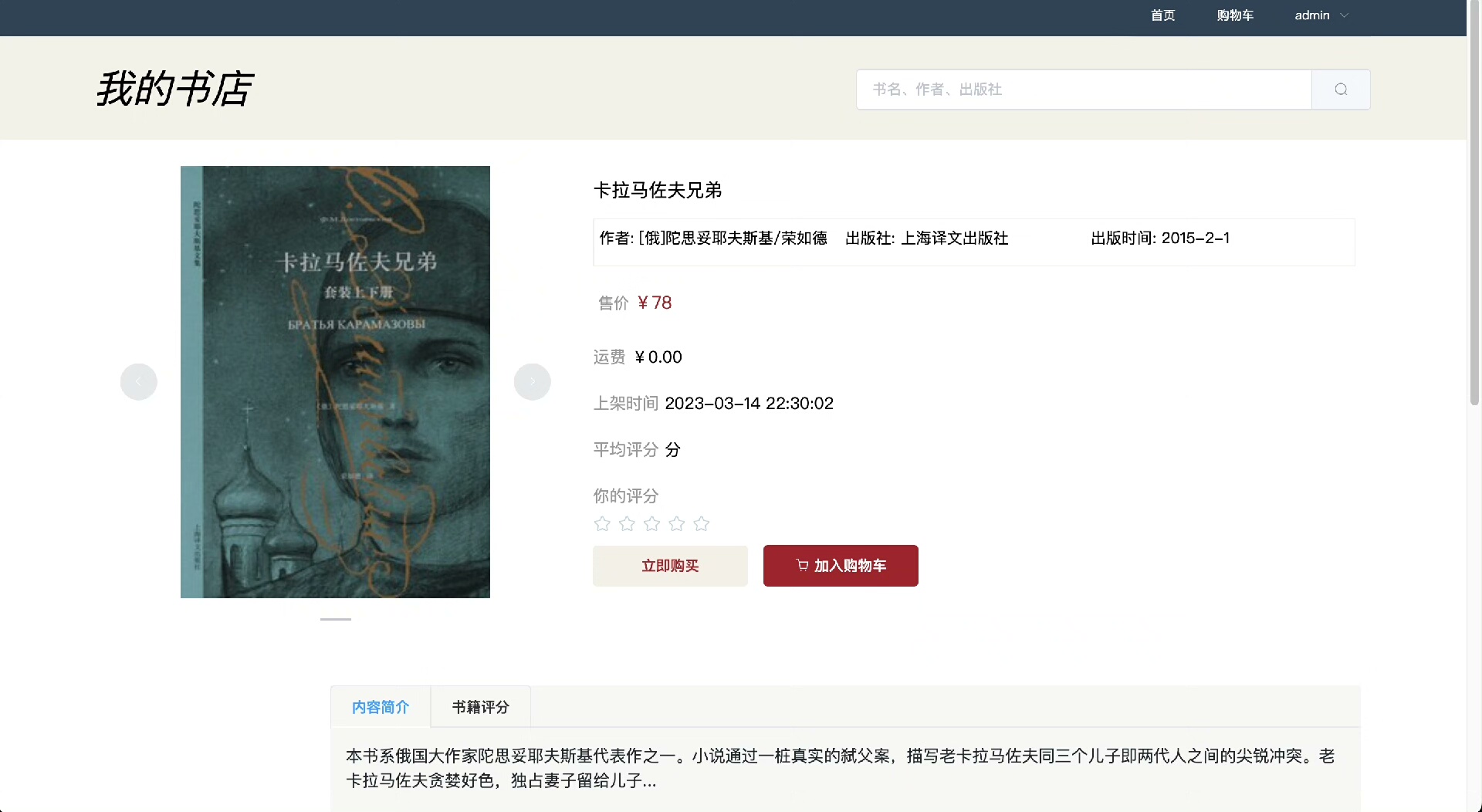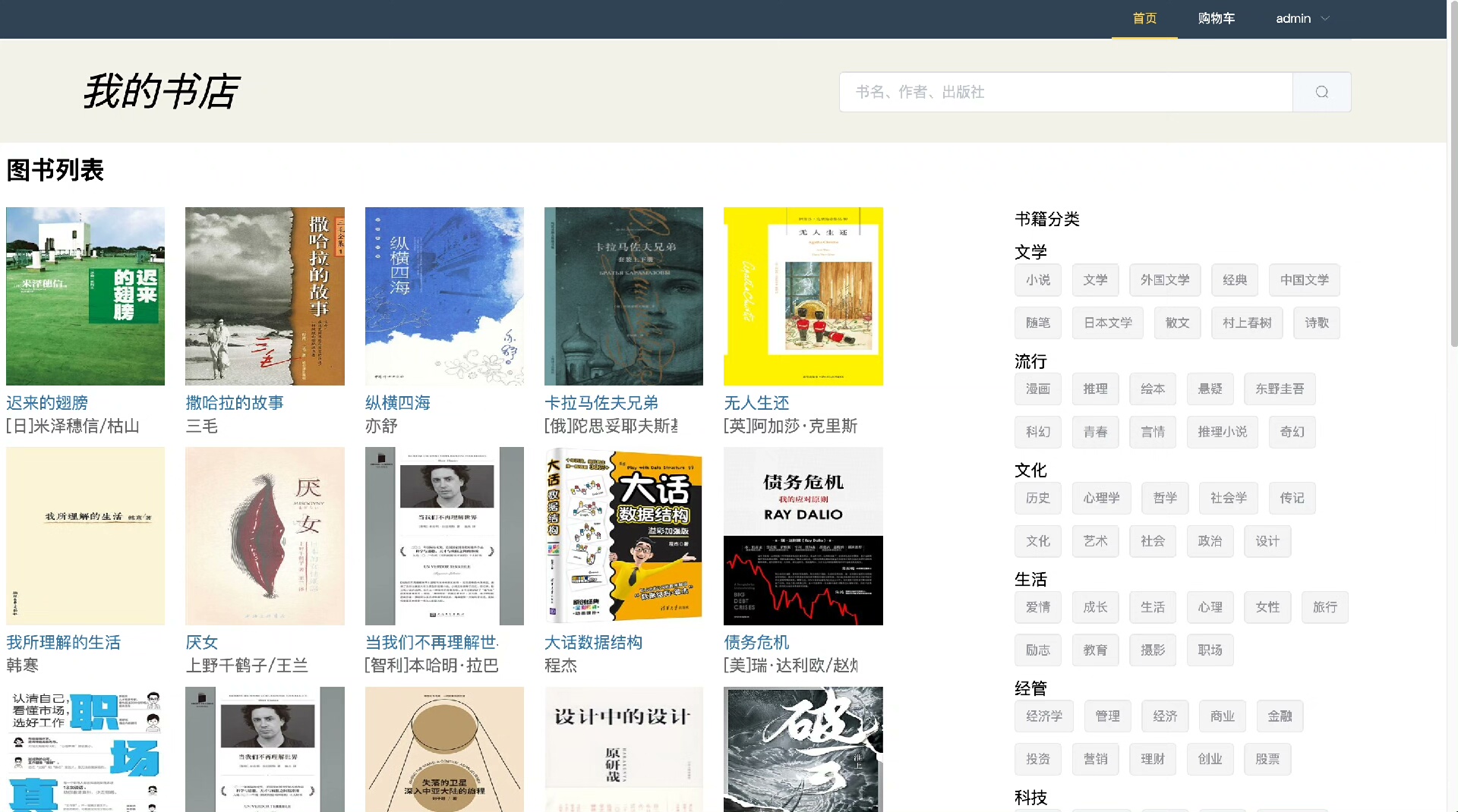 普通用户可完成图书浏览、关键词/分类号搜索、个人信息维护、密码安全更新、图书评分收藏、车管理、订单全流程跟踪及首页个性化推荐;管理员则拥有全量用户审核、图书CRUD、图书分类体系配置等后台管控能力。