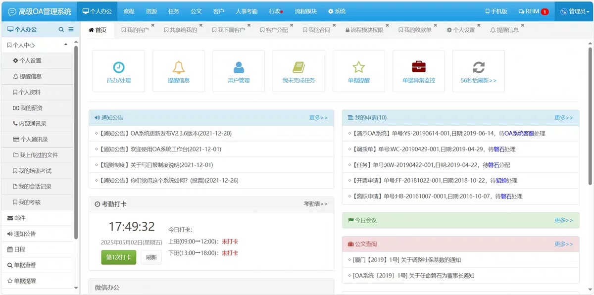 系统涵盖日常办公所需的流程审批、任务分配、日程管理、公告通知等OA功能,帮助企业实现无纸化办公。