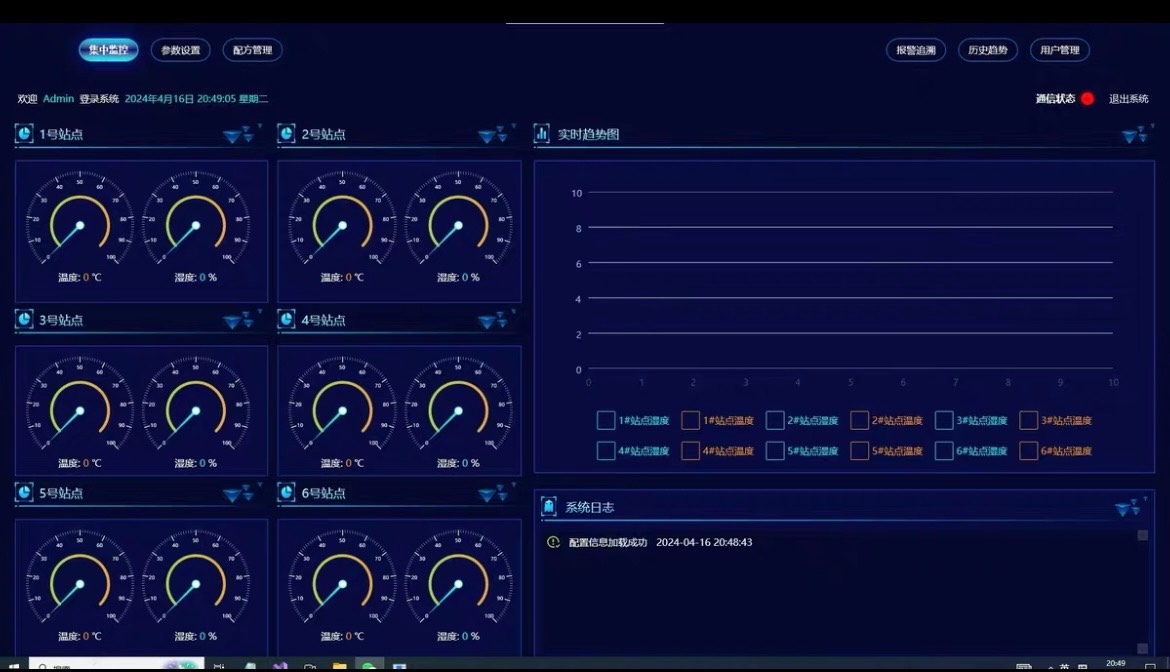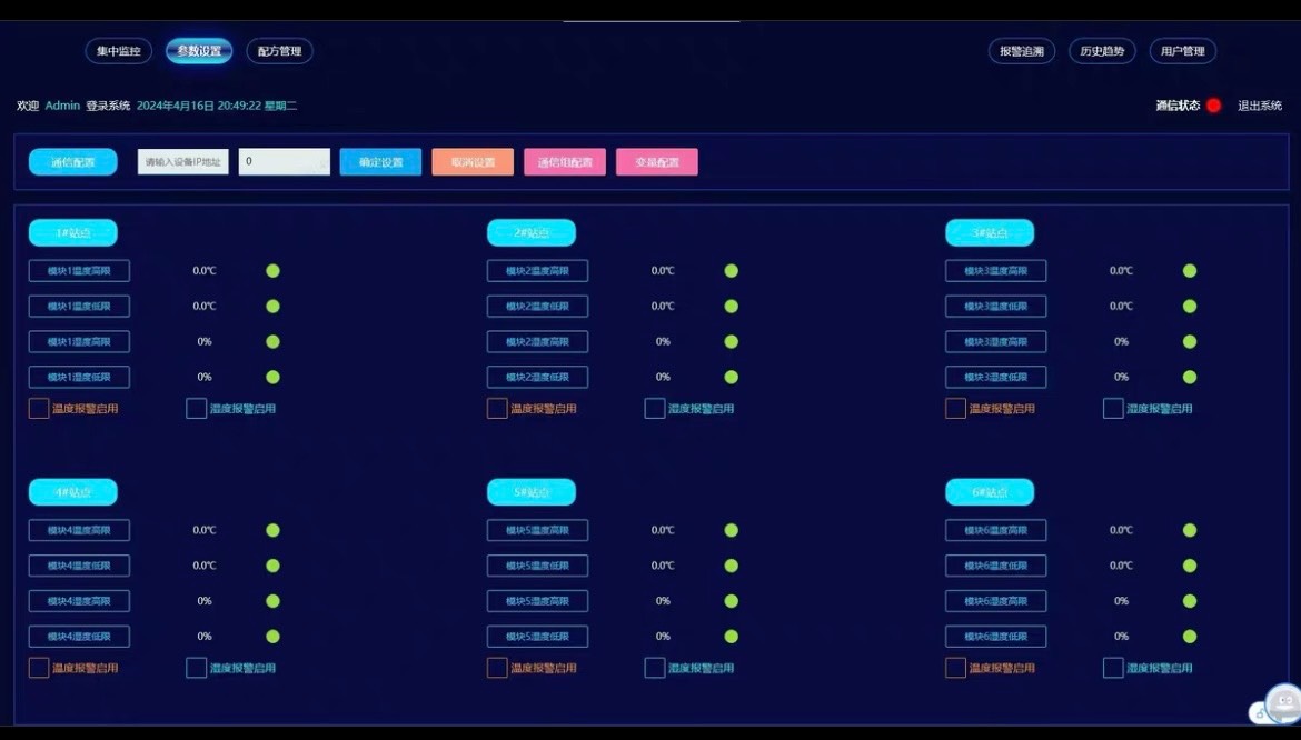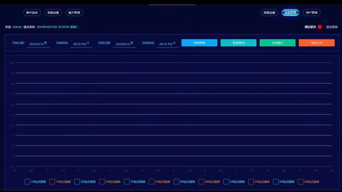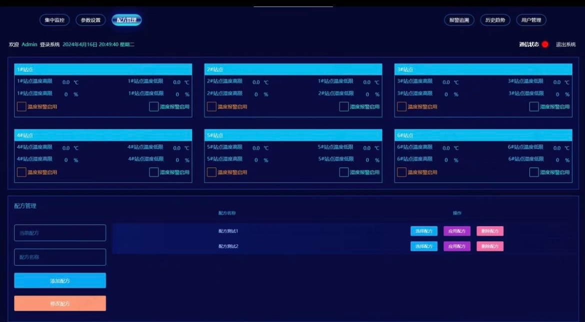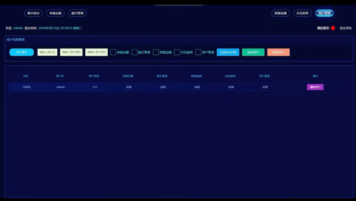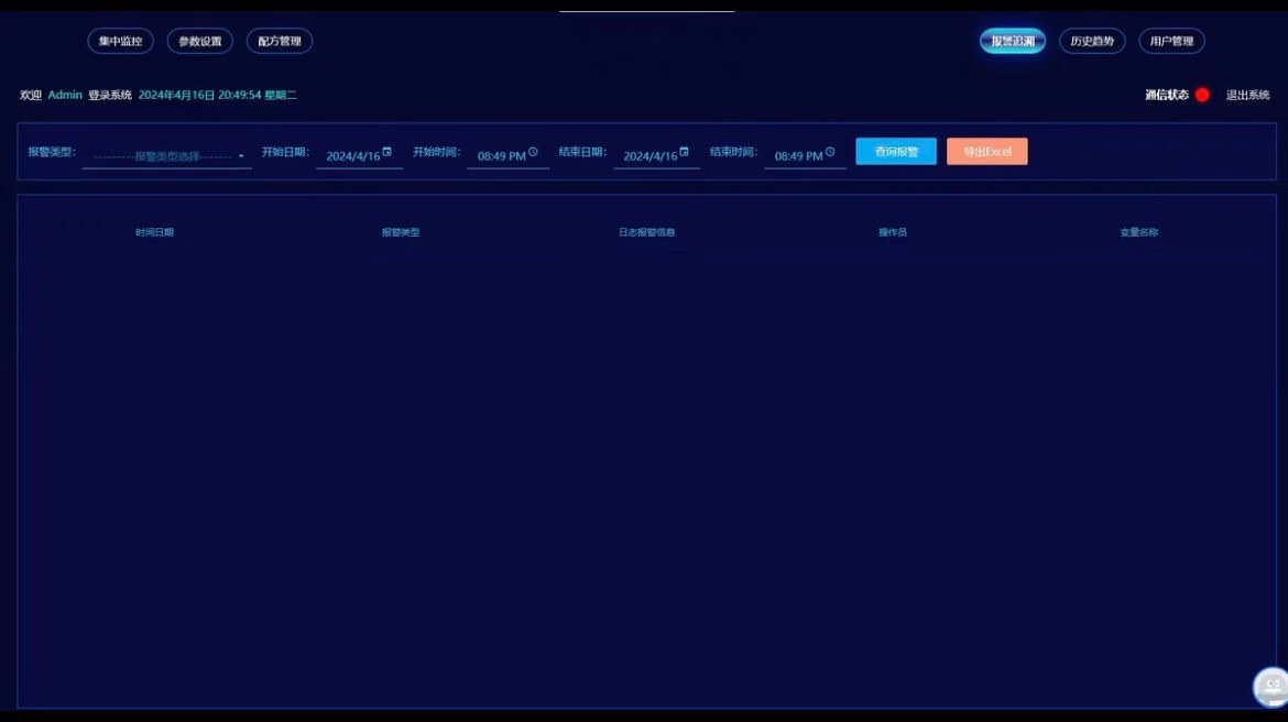 系统具备完善的工控功能模块,包括实时主界面、运行参数设定、配方管理机制、报警信息追溯以及通信状态显示等核心功能,满足生产现场对数据可视化与操作灵活性的需求。