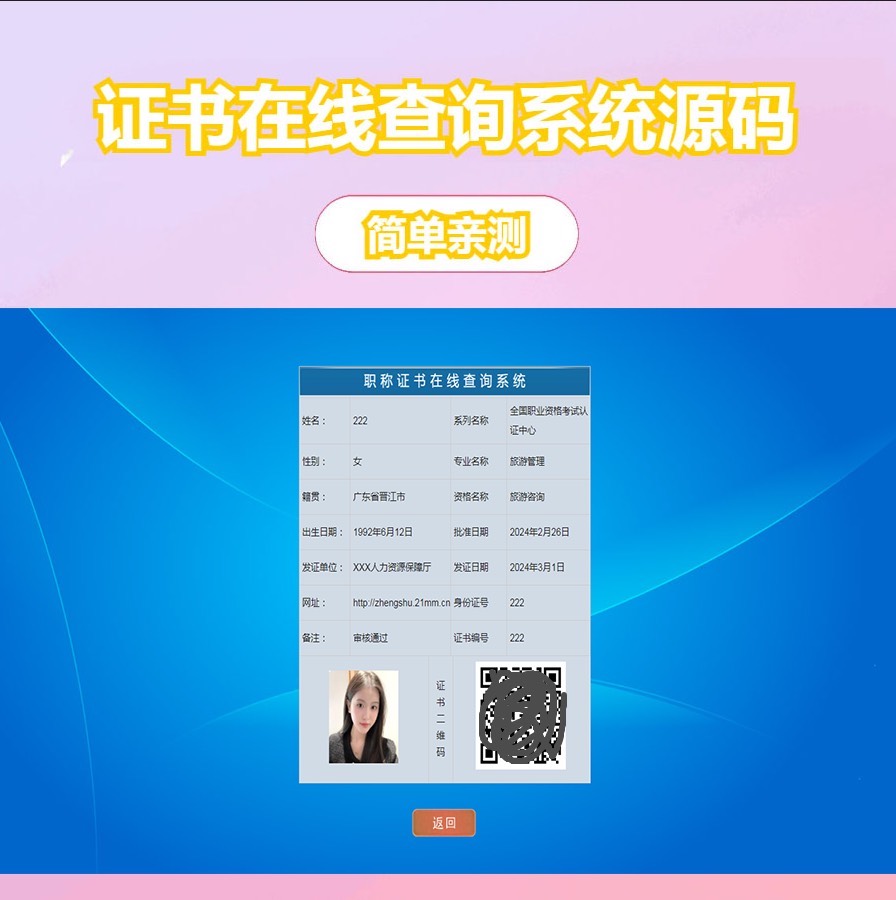 本为一套完整的企业级职业资格证书查询系统PHP源码,专为技能认证机构、教育培训机构及企事业单位设计,支持职称证书的二维码生成与防伪验证功能,实现高效、安全的电子化证书管理。